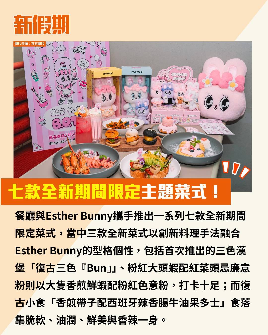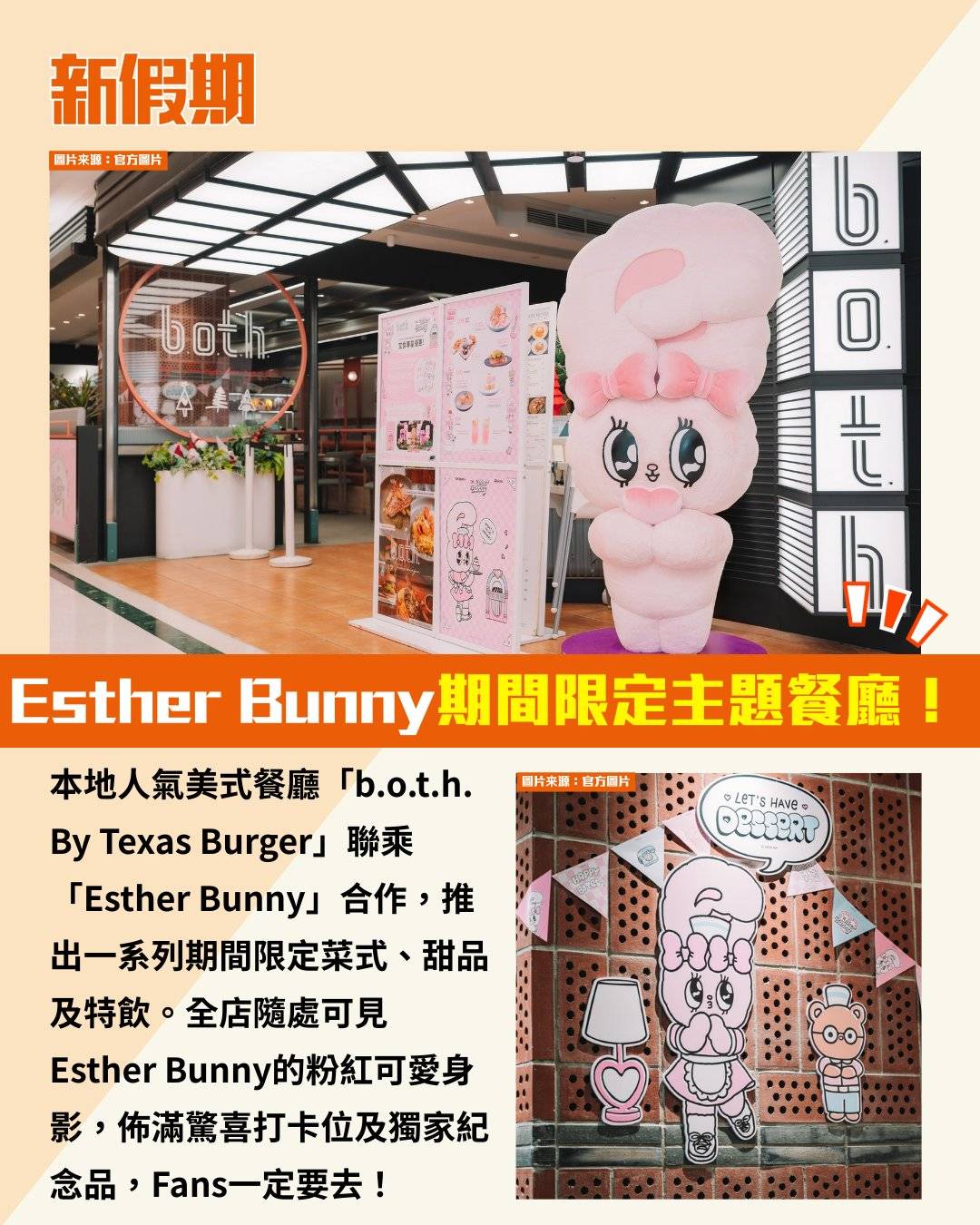 本地人氣美式餐廳「b.o.t.h. By Texas Burger」聯乘「Esther Bunny」合作,推出一系列期間限定菜式、甜品及特飲。全店隨處可見Esther Bunny的粉紅可愛身影,佈滿驚喜打卡位及獨家紀念品,Fans一定要去!