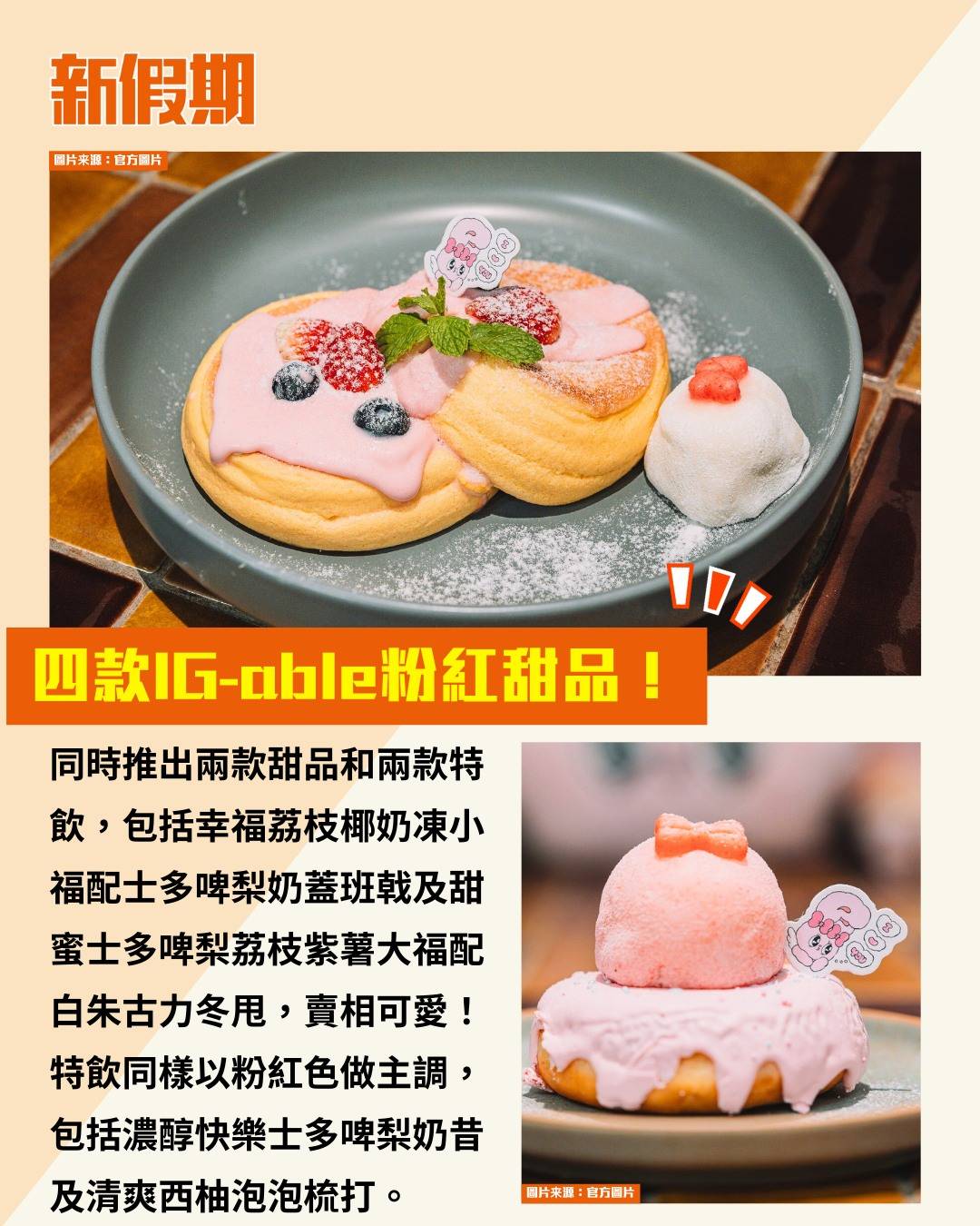 是次聯乘系列同時推出兩款甜品和兩款特飲,包括幸福荔枝椰奶凍小福配士多啤梨奶蓋班戟及甜蜜士多啤梨荔枝紫薯大福配白朱古力冬甩,賣相可愛!特飲同樣以粉紅色做主調,包括濃醇快樂士多啤梨奶昔及清爽西柚泡泡梳打。
