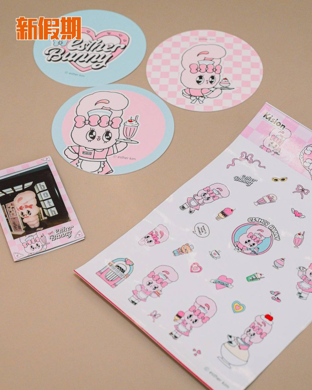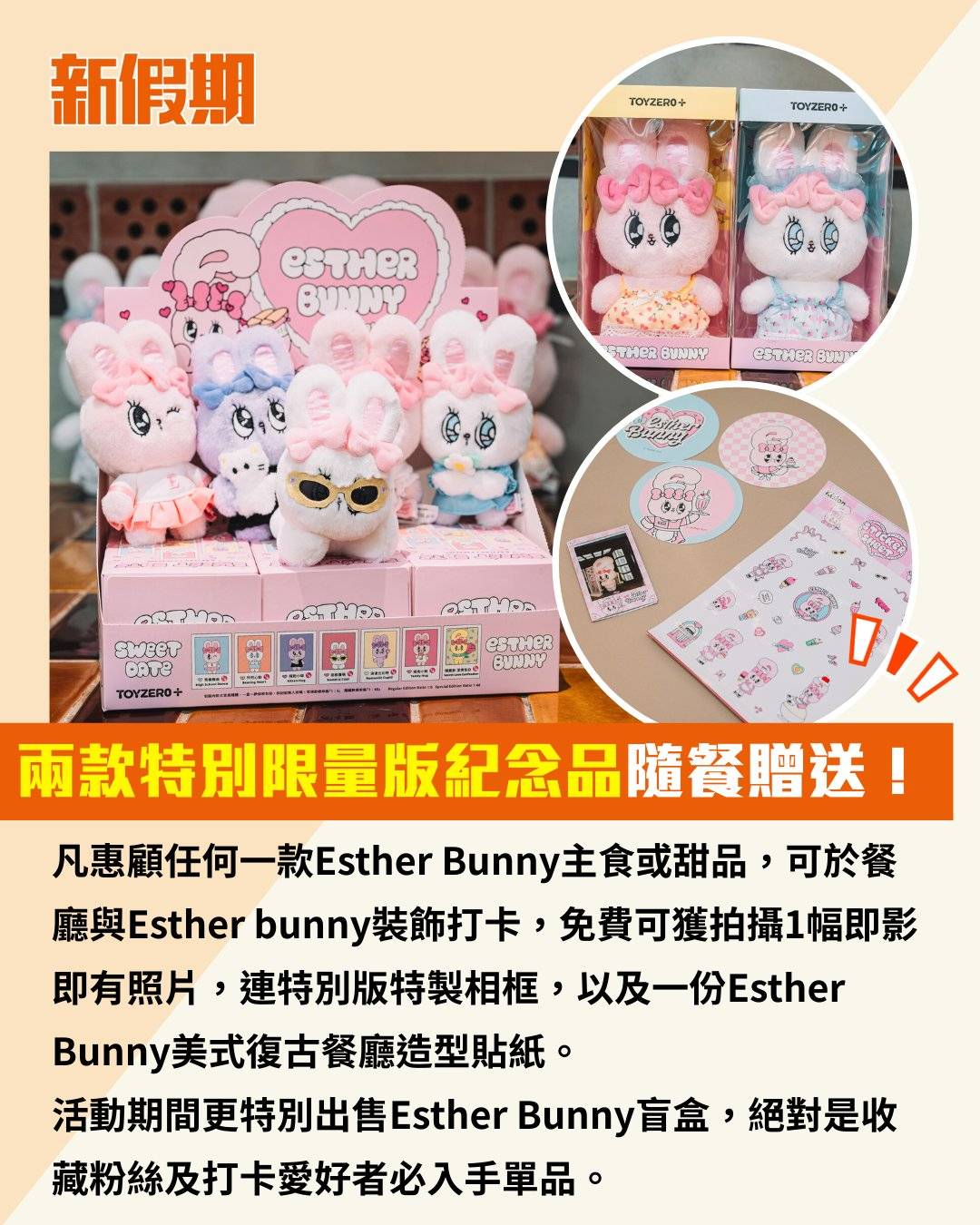 凡惠顧任何一款Esther Bunny主食或甜品,可於餐廳與Esther bunny裝飾打卡,免費可獲拍攝1幅即影即有照片,連特別版特製相框,以及一份Esther Bunny美式復古餐廳造型貼紙。活動期間更特別出售Esther Bunny盲盒,絕對是收藏粉絲及打卡愛好者必入手單品。