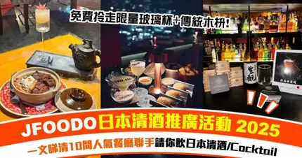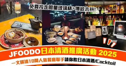如果你係清酒新手,或者覺得清酒比較難入門,今次活動就絕對係一個好機會!由即日起至2025年12月15日,只要喺指定嘅合作餐廳或酒吧堂食,並追蹤JFOODO嘅官方社交媒體(Instagram / Facebook:@jfoodosakehk),就可以即時免費享用一杯由專業團隊精選嘅日本清酒或清酒雞尾酒。唔使識飲酒,都可以試吓有微炭酸感嘅清酒,或者果香味濃郁嘅sake cocktail,無論你鍾意甜啲、清爽啲,定係想飲返杯輕口嘅nightcap,都總有一款啱你口味,親身體驗清酒嘅細膩層次同中式料理點樣可以完美融合。