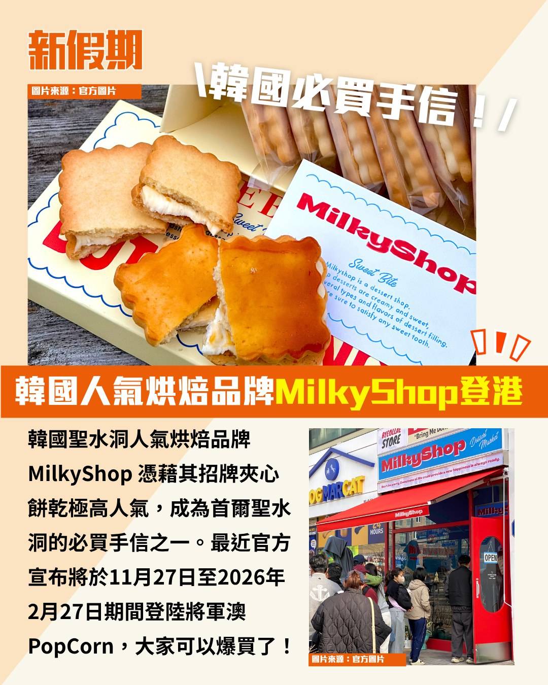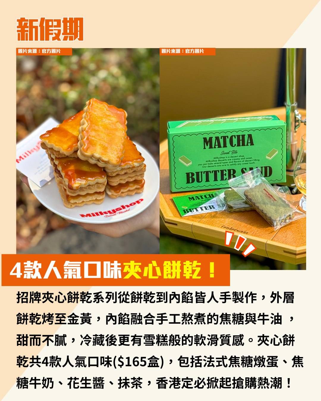 韓國聖水洞人氣烘焙品牌 MilkyShop 憑藉其招牌夾心餅乾,成為首爾聖水洞的必買手信之一,經常大排長龍。最近官方宣布將於11月27日至2026年2月27日期間登陸將軍澳PopCorn,大家可以爆買了!招牌夾心餅乾系列從餅乾到內餡皆人手製作,外層餅乾烤至金黃,內餡融合手工熬煮的焦糖與牛油 ,甜而不膩,冷藏後更有雪糕般的軟滑質感。夾心餅乾共4款人氣口味($165盒),包括法式焦糖燉蛋、焦糖牛奶、花生醬、抺茶,香港定必掀起搶購熱潮!