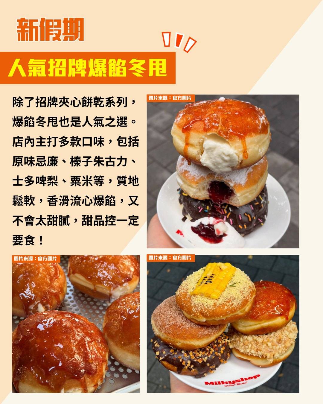 除了招牌夾心餅乾系列,爆餡冬甩也是人氣之選。店內主打多款口味,包括原味忌廉、榛子朱古力、士多啤梨、粟米等,質地鬆軟,香滑流心爆餡,又不會太甜膩,甜品控一定要食!