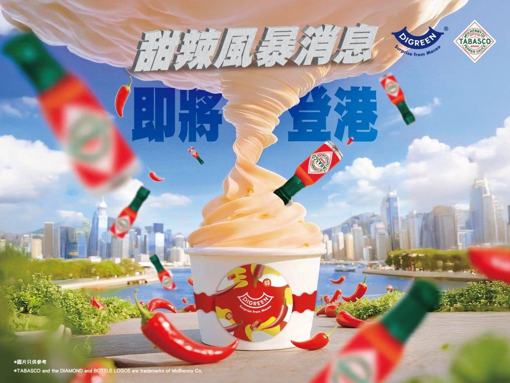 來自澳門的雪糕品牌 DIGREEN 與全球知名辣椒醬品牌 TABASCO,首度破格聯乘,於 9月30日起推出全港首創辣椒仔牛乳軟雪糕!每杯雪糕仲附送史上最細TABASCO小瓶,食客可以自由加辣,亦可以珍藏隨身攜帶!