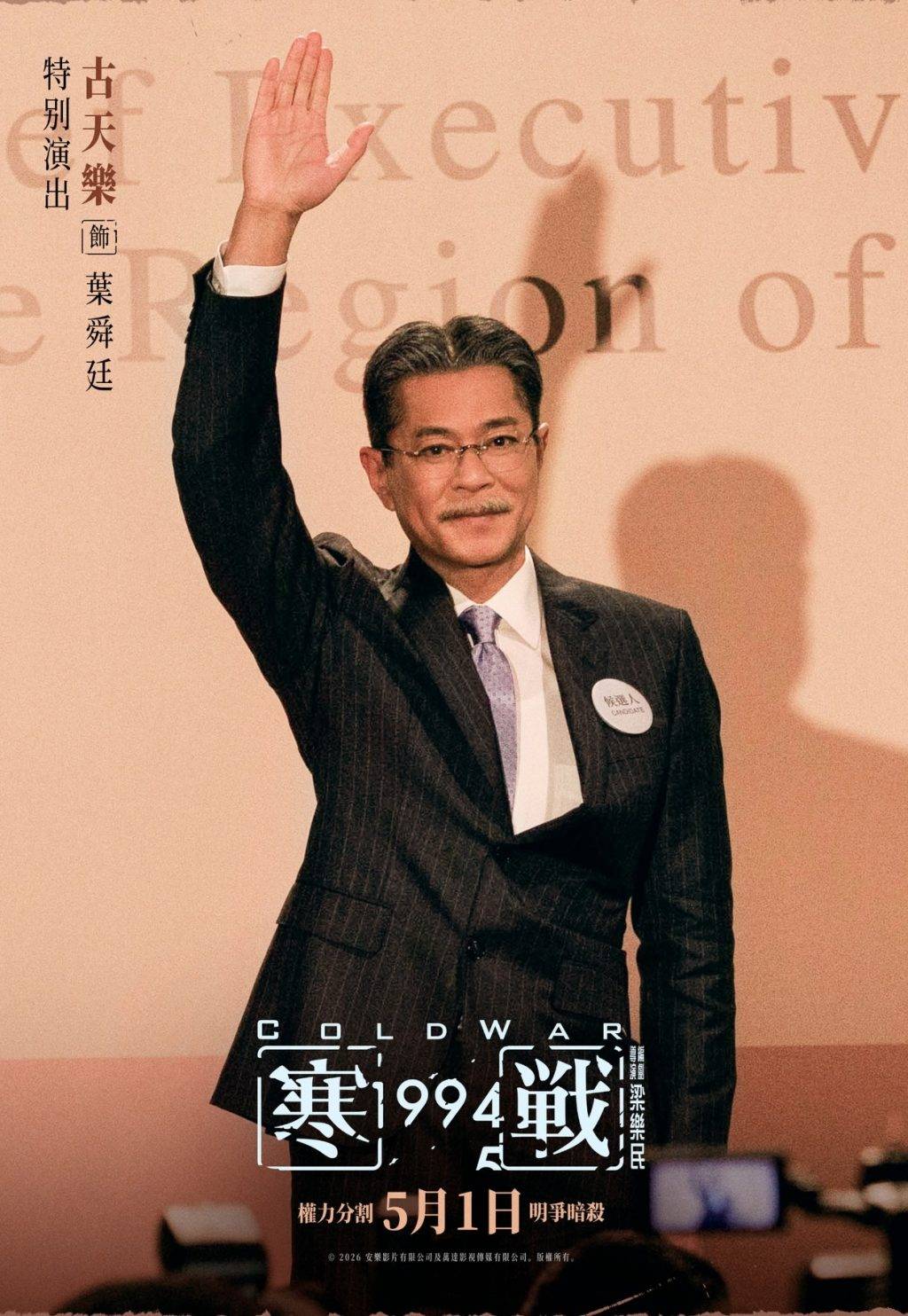 55歲的古仔在《寒戰1994》中飾演候任特首葉舜廷,預告片中他在上任前夕面對動盪變局,神情凝重。古天樂於2018年憑《殺破狼·貪狼》首度奪得香港電影金像獎最佳男主角,片中他飾演一名為尋女遠赴泰國的父親,動作與情感並重,展現高度投入的演出。多年來累積穩定作品量,此次封帝被視為對其長期努力的肯定。今次在《寒戰1994》中,古天樂要演繹政治人物的複雜心理,相信又是另一次演技突破。