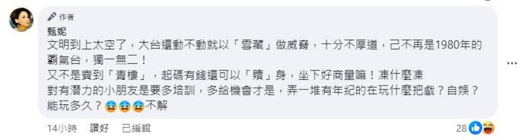 甄妮日前在Facebook專頁寫下「忍無可忍天怒 人怨 反」八個大字,明顯怒火中燒。她雖然沒有指名道姓,但矛頭直指一位「『知少少扮代表』嘅編劇老人」,怒斥對方心地惡毒,批評他一直看不起香港,毫無飲水思源之心。甄妮更不留情面地形容對方「唯一的生計就是 :兩片唇+悪毒心腸」,直指此人「狗嘴吐不出象牙」,言辭之間充滿不屑,認為對方只是為了博取關注,刷存在感。