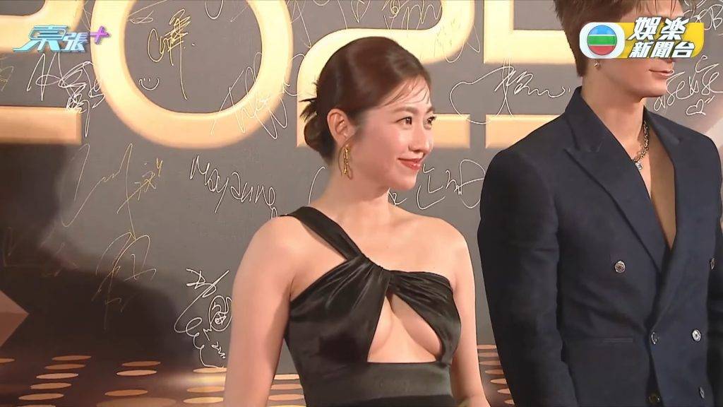 張曦雯今次玩得大膽,黑色露背晚裝胸前中間開窿直Deep到肚臍位,疑似真空上陣,半球若隱若現,火辣程度直線爆表!雖然最後一刻先攞到呢件裙,但她大方着出嚟,性感指數全開,勁吸睛!