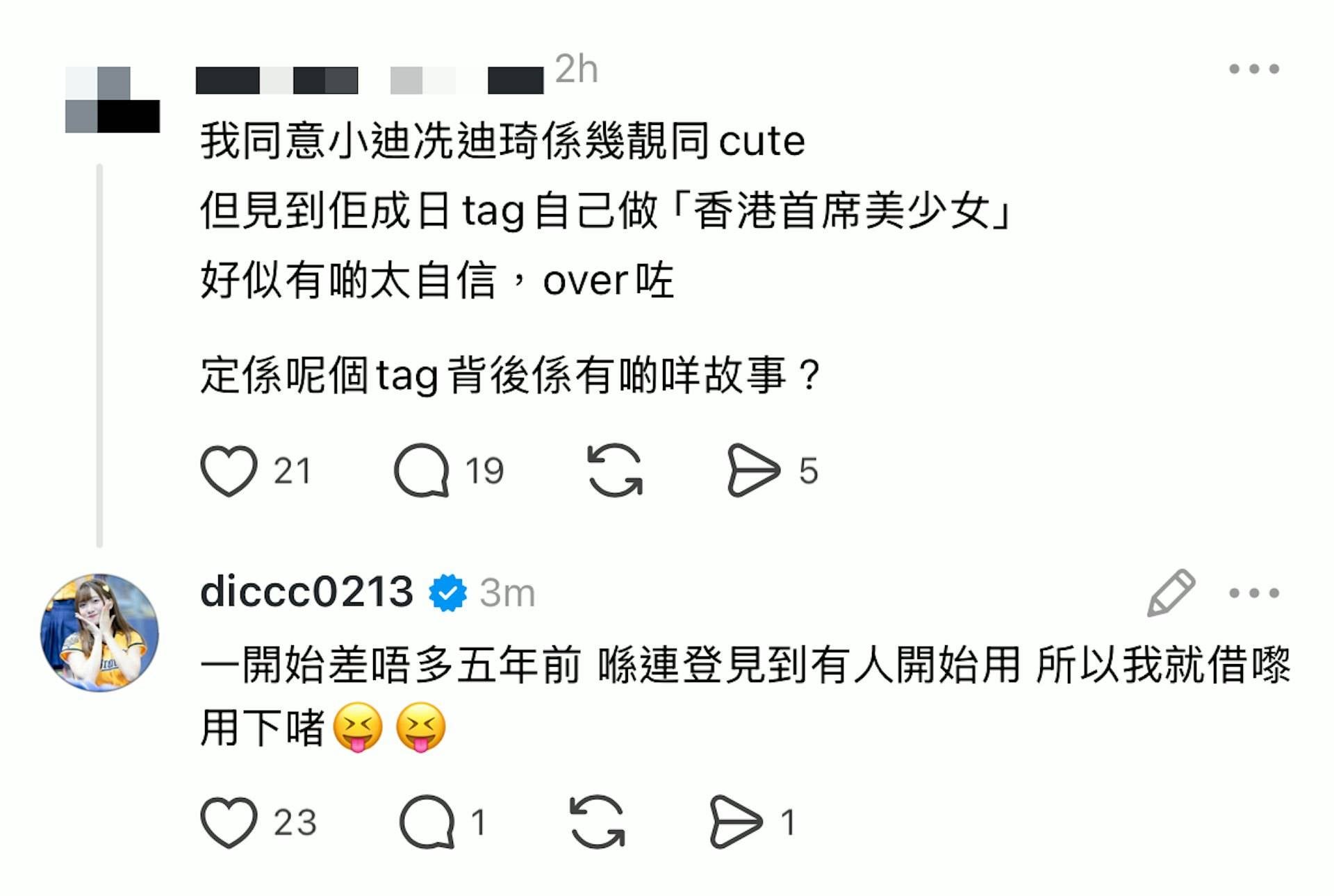 小迪女大十八變後轉戰台灣發展,先後加入女團AKB48 Team TP及成為「中信兄弟」啦啦隊Passion Sisters成員,憑住Fit爆身材在台港兩地大受歡迎。近期她頻頻返港參與不同項目,包括月前的《墨魚遊戲2》,又為HOY TV拍攝新節目《100樣可能》。雖然事業發展順利,但她在IG發文時經常加上「香港首席美少女」這個hashtag,令不少網民感到疑惑。有網民更直接開post討論:「我同意小迪冼迪琦係幾靚同cute,但見到佢成日tag自己做『#香港首席美少女』,好似有啲太自信,Over咗,定係呢個tag背後係有啲咩故事?」