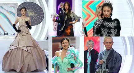要數全晚焦點,必定是主持馮盈盈的性感戰衣!該套晚裝由《剪裁魔法師》首季冠軍得主姚子裕設計,若隱若現的透視效果將馮盈盈的完美身段表露無遺,盡顯高貴與性感。另一邊廂,為模特兒梁凱晴操刀的設計師羅巧蒨亦絕不手軟,以十八種顏色的網布重疊,營造出「花花纏身」的視覺效果,而前胸及手袖的獨特剪裁,更是將梁凱晴的驕人身材完全展現,性感指數爆燈,與馮盈盈的造型可謂平分秋色,成功掀起全晚高潮。