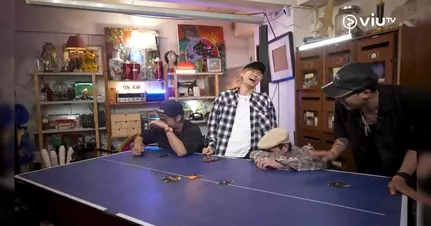 四子除咗喺旅館內玩卡片遊戲,仲玩埋多款人氣Board Game,其中包括近期喺網上爆紅嘅「彈彈棋」!他們分成兩組對決,Lokman對Alton、Frankie對AK,結果AK實力明顯更勝一籌,一開始就連環得分,搞到Frankie再度淪為「團欺」,被其他成員狂玩狂取笑,全場笑聲不斷。好在最後Frankie都總算爭口氣成功得分,場面又爆笑!