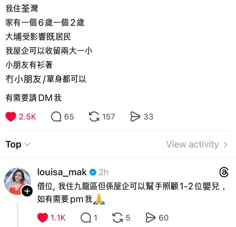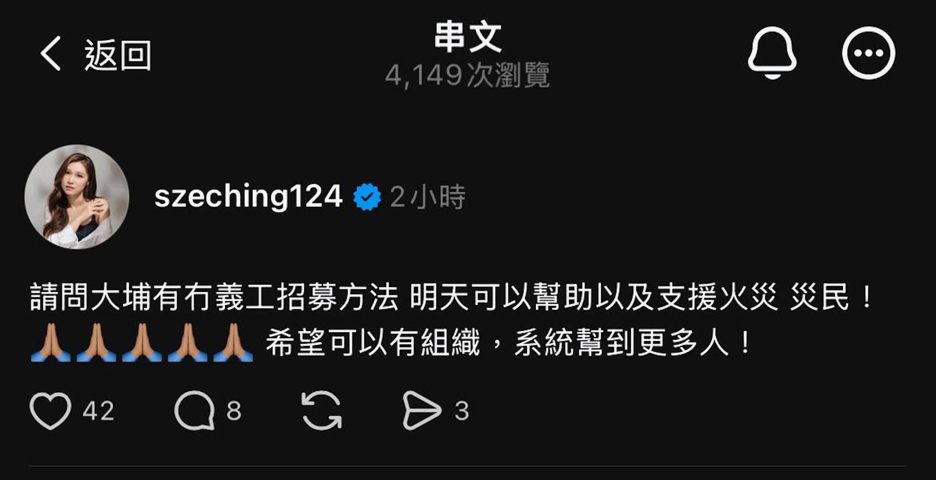 宏福苑火災 藝人救災 「東張女神」麥詩晴更在社交平台發文尋找義工機會(圖片來源:threads)