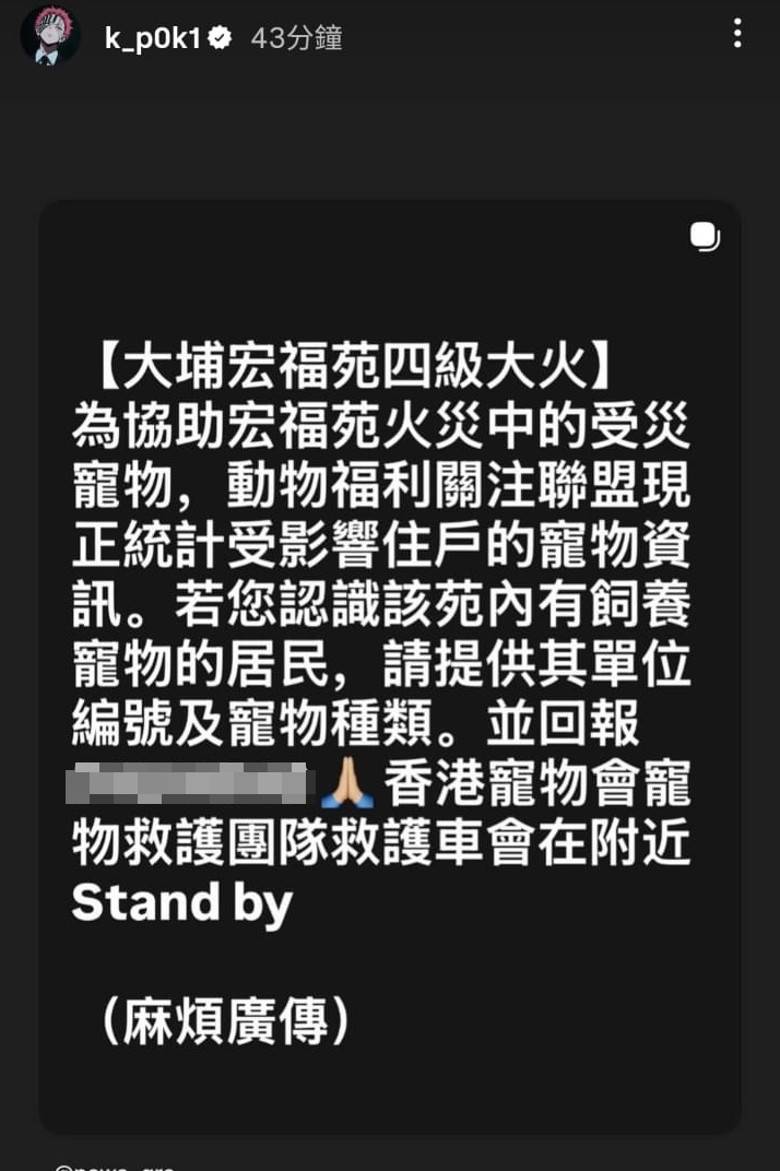 宏福苑火災 藝人救災 保錡提供援助資訊。(圖片來源:IG@k_p0k1)