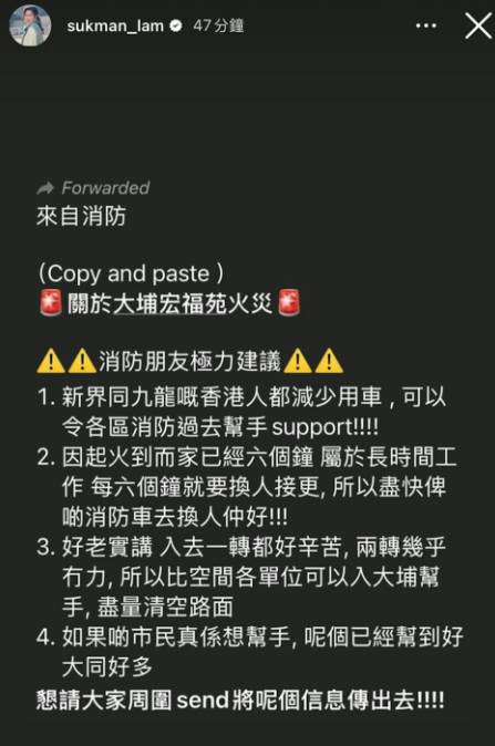 宏福苑火災 藝人救災 大小姐林淑敏轉發資訊(圖片來源:IG@sukman_lam)