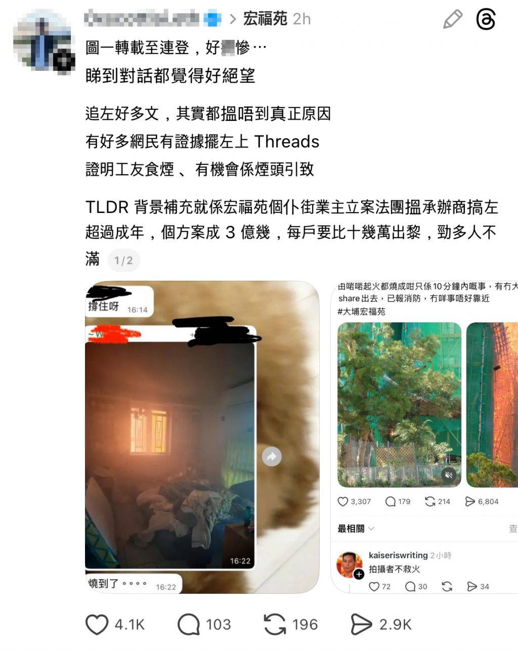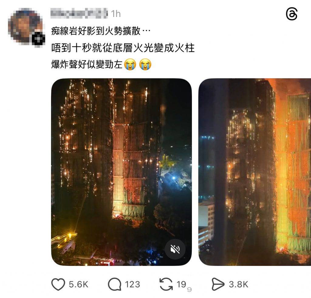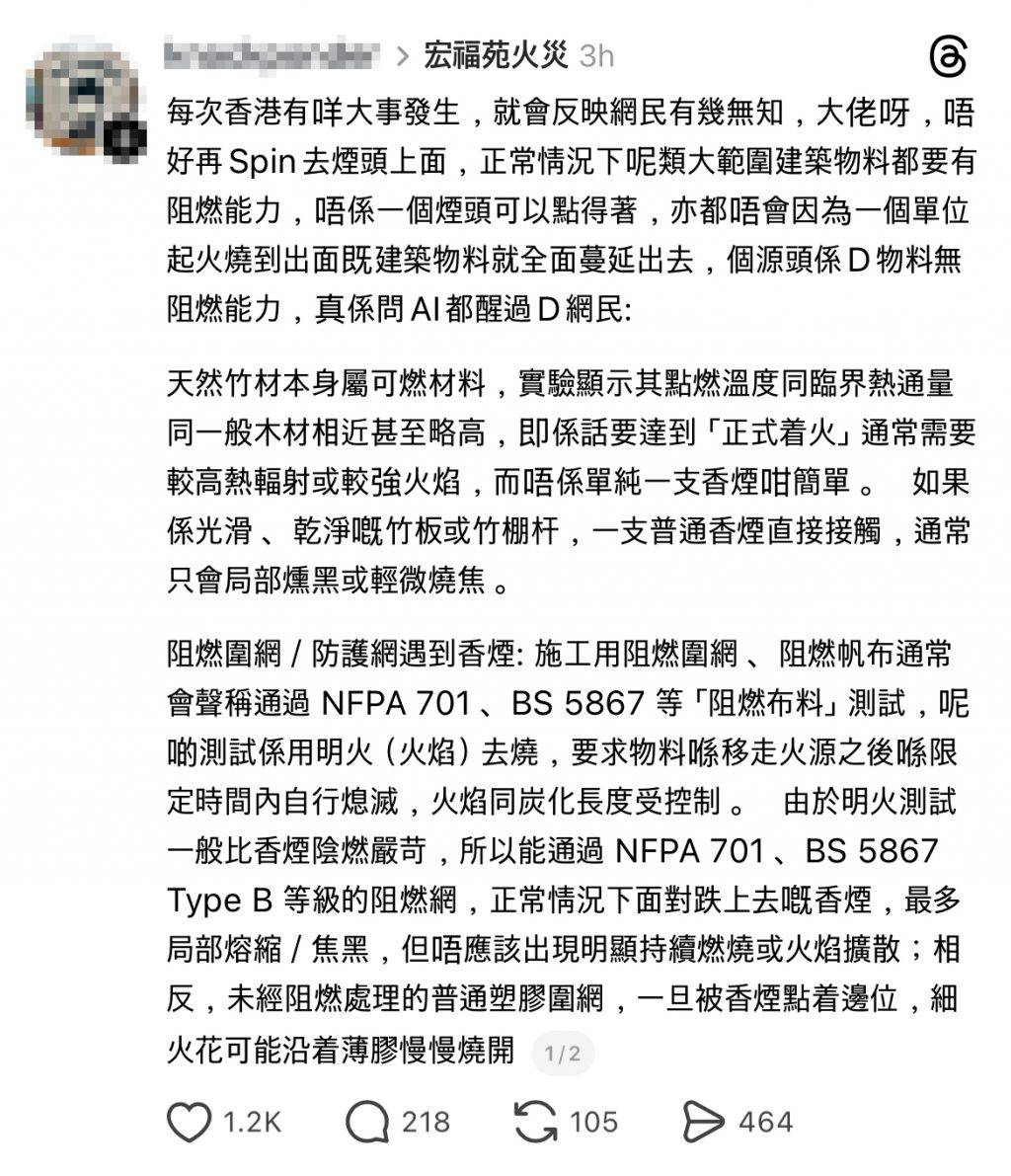事件在社交媒體引發激烈討論,有網民在Threads等平台上載證據,指工友吸煙可能是煙頭引致火災的原因。不過亦有網民強烈反駁這種說法,批評「每次香港有咩大事發生,就會反映網民有幾無知」。反駁者指出正常情況下建築物料都要有阻燃能力,「唔係一個煙頭可以點得著」,質疑問題源頭是建築材料缺乏阻燃能力。該網民更引用技術資料解釋,指天然竹材和阻燃圍網在正常情況下不應被單一香煙點燃,認為今次火災涉及更深層的建築安全問題。