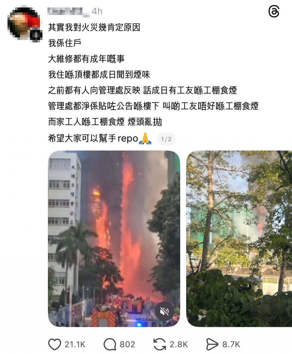 有宏福苑住戶在網上發文爆料,聲稱對火災原因「幾肯定」。該名住戶透露,屋苑大維修工程已進行近一年,住在頂樓的他經常聞到煙味,「之前都有人向管理處反映,話成日有工友喺工棚食煙」。住戶指管理處只是在樓下貼公告,叫工友不要在工棚吸煙,但問題一直未有改善。住戶更直言「而家工人喺工棚食煙,煙頭亂拋」,認為火災很大機會是工友吸煙或住戶扔煙頭引起,因為「火初起時係喺一樓」。