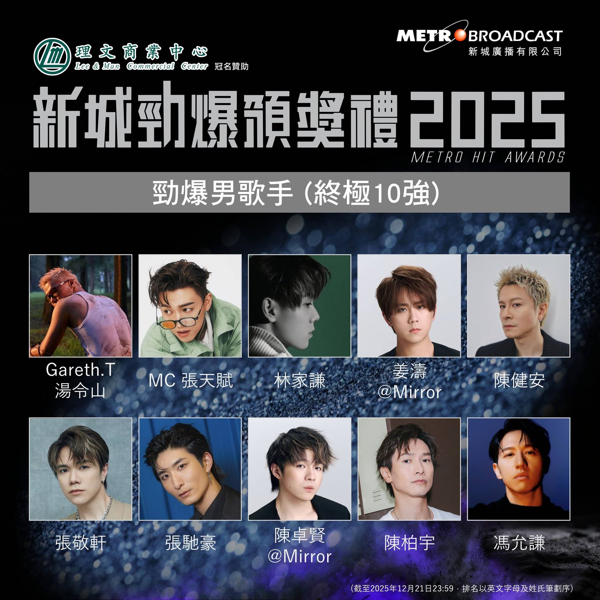 今年勁爆男歌手十強名單星光熠熠,Mirror成員姜濤和陳卓賢雙雙入圍,與林家謙、張敬軒、陳健安、陳柏宇、馮允謙等實力派歌手同台競技,另外還包括Gareth.T湯令山、MC張天賦和張馳豪各有佳作。