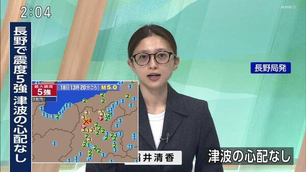 日本長野縣於4月18日下午1時20分發生5.0級強震,震度一度達到「5強」。據了解,NHK主播稻井清香當時正處於休假狀態,但災情一出,她第一時間放棄休息直衝電視台。網民推算她僅花了約10分鐘便趕回攝影棚,於1時31分已坐定定開始播報。由於事出突然,她完全來不及化妝梳洗,戴著深色黑框眼鏡、隨手用髮圈紮起頭髮,西裝外套內甚至還穿著私下的白T恤,與平日端莊精緻的形象形成強烈反差,但這份真實卻意外震撼無數觀眾。