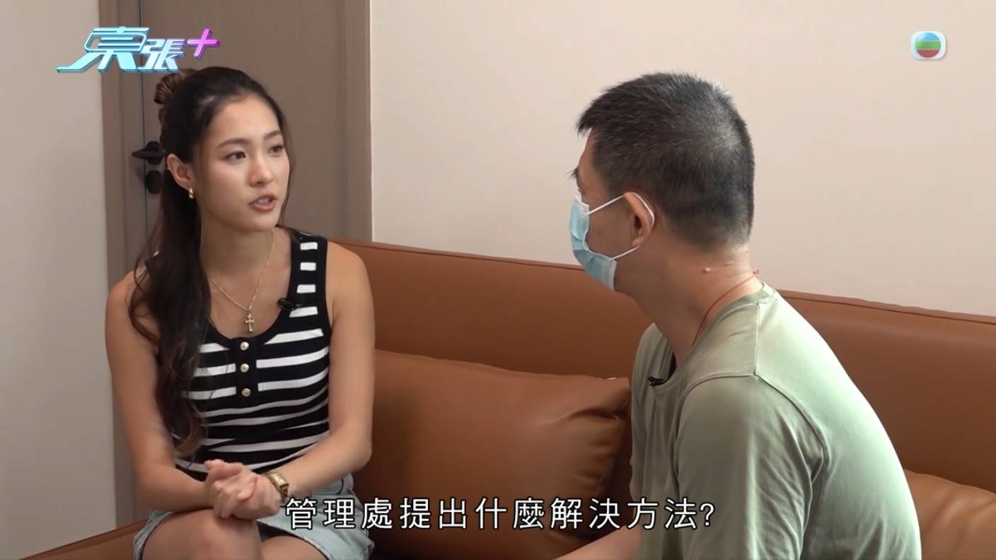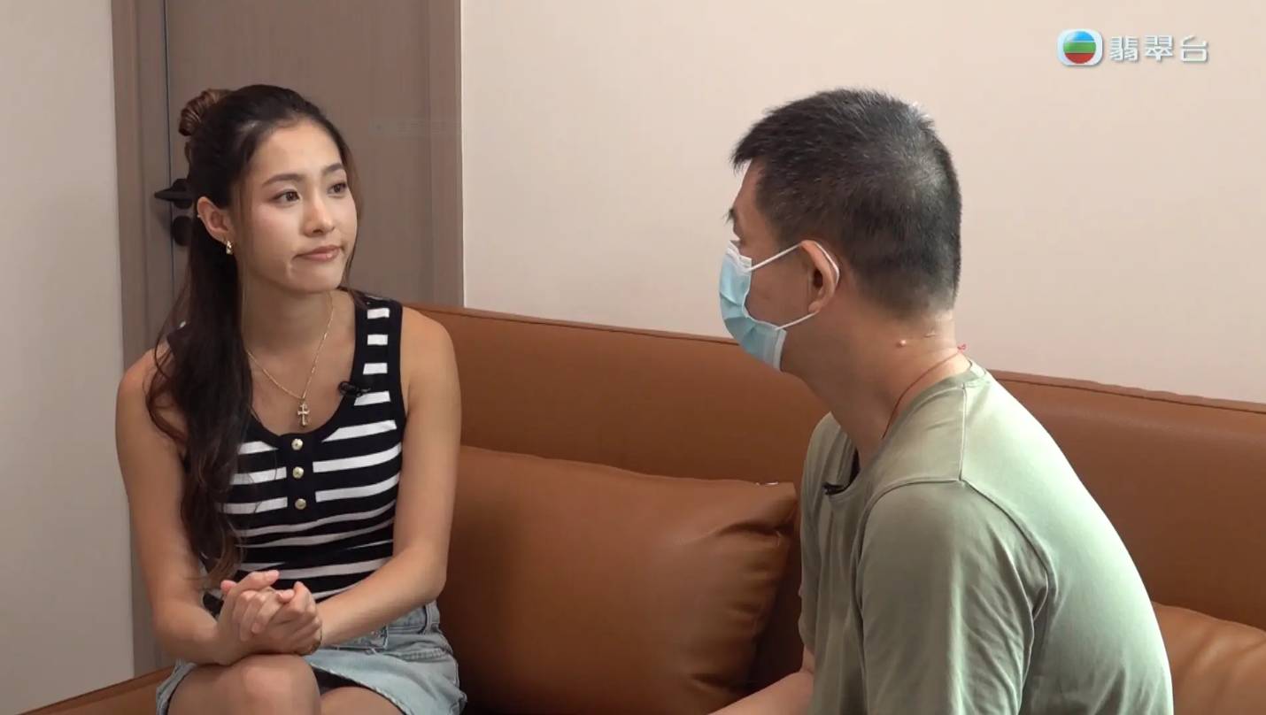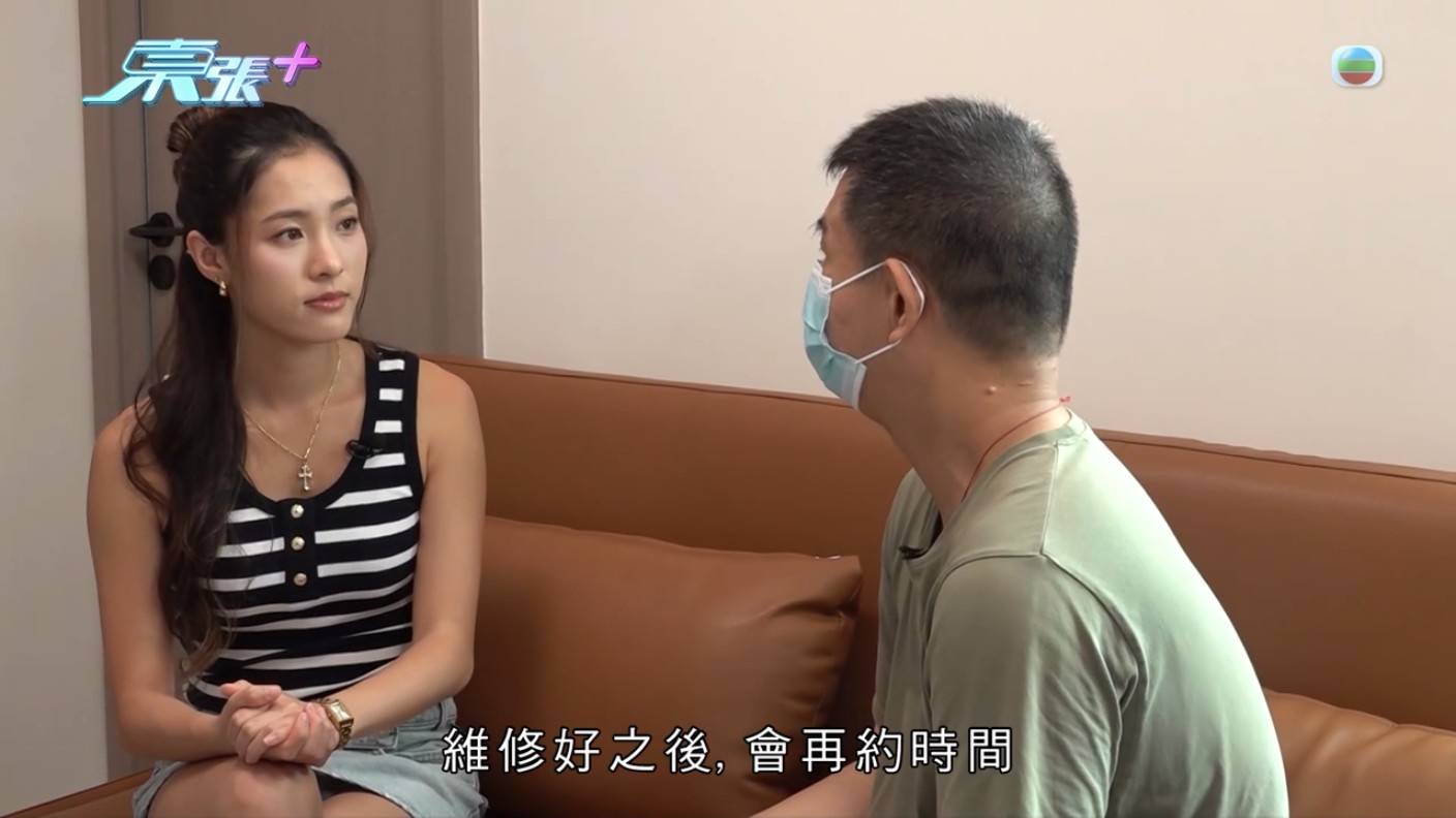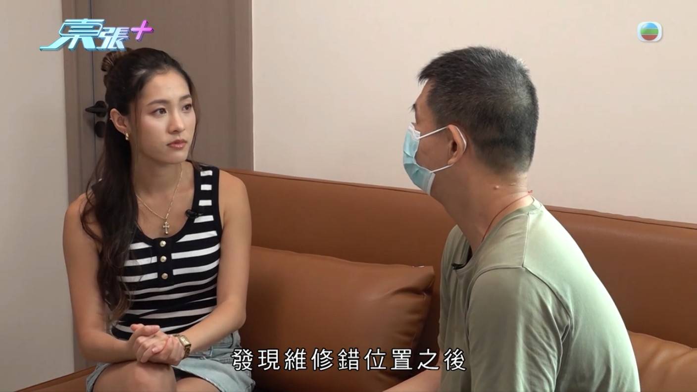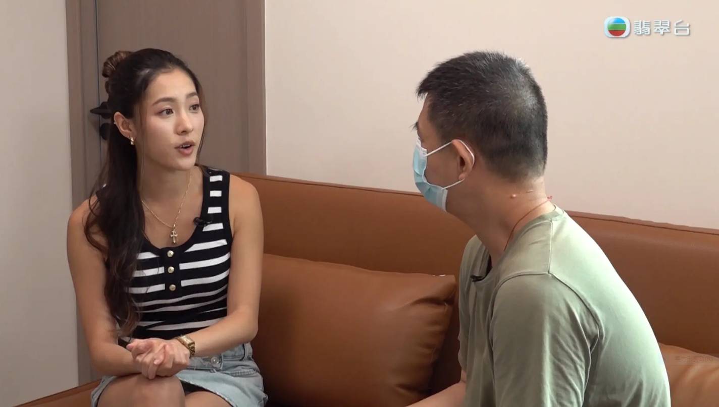朱文慧身穿橫間小背心配短裙,坐在梳化上訪問事主馮先生,網民對朱女的表現議論紛紛。(圖片來源:TVB)
