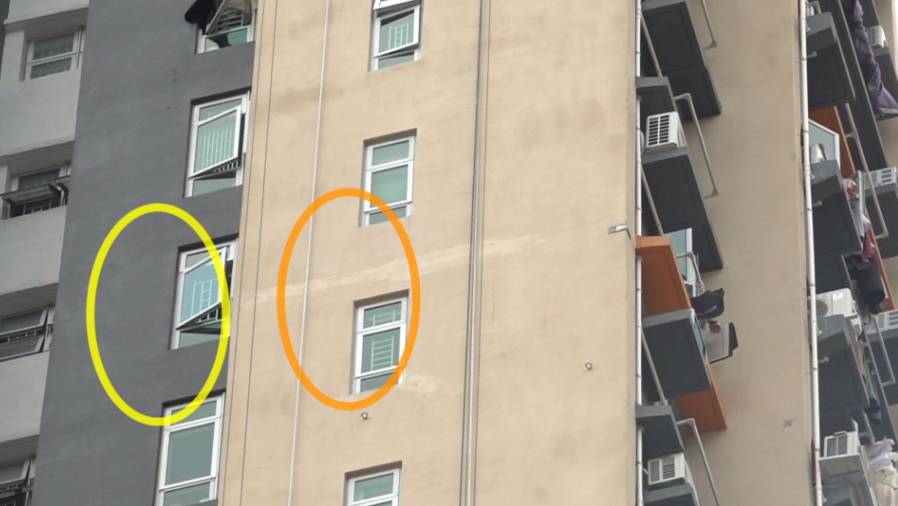 原本是黃色圈客廳外牆滲水,但被錯誤鑿開橙色圈房間外牆維修。(圖片來源:TVB)