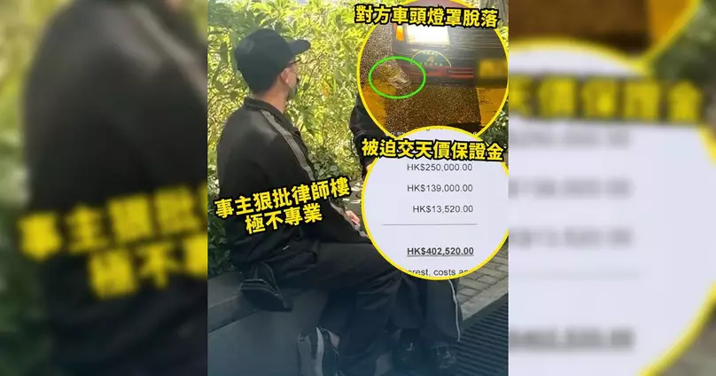 事件發生在2024年4月5日,Rayman在新蒲崗與一輛的士相撞,對方車頭燈罩脫落,事後報警處理。Rayman被告不小心駕駛,罰款1,000元。到11月,他收到對方律師信,被索償近40萬元。到2025年3月中,Rayman收到保險公司的律師信,估計需賠償387,000元。保險公司律師表示,如果事主找私人聘請的律師,要交387,000元保證金證明有能力賠償,他們就不會介入事件。Rayman只好將保證金放在自己聘請的律師樓,案件正式交由該律師樓跟進。