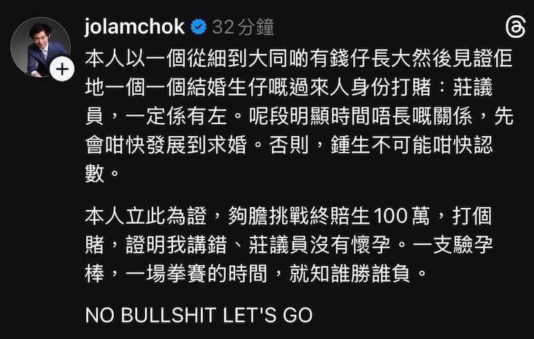 除了拍片,林作更在IG發文,以「從小與有錢仔長大」的過來人身分斷言:「莊議員,一定係有左。」他認為二人關係發展迅速,鍾培生肯「閃婚認數」,背後必有原因。林作更貼出相關新聞截圖,留下挑機宣言:「本人立此為證,夠膽挑戰終賠生100萬,打個賭,證明我講錯、莊議員沒有懷孕。一支驗孕棒,一場拳賽的時間,就知誰勝誰負。NO BULLSHIT LET’S GO。」這個百萬豪賭立即引起網民熱烈討論,不少人都在猜測林作是否真的掌握了什麼內幕消息。