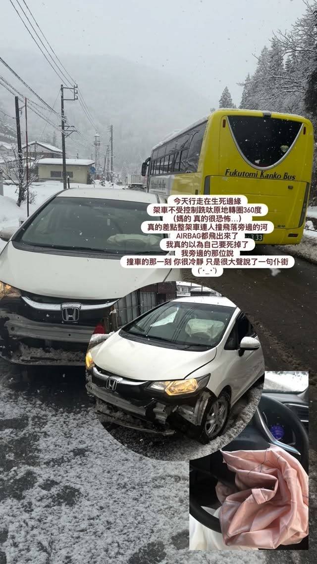 梁允瑜在Instagram限時動態分享了這次驚險經歷,上載了一段暴雪中置身公路的短片,以及車頭嚴重撞毀的照片。她心有餘悸地寫道:「今天行走在生死邊緣,架車不受控制跣呔原地轉圈360度(真的很恐怖……)真的差點整架車連人撞飛落旁邊的河,AIRBAG都飛出來了,我真的以為自己要死掉了!」從照片可見,車頭部分嚴重損毀,情況相當嚇人。