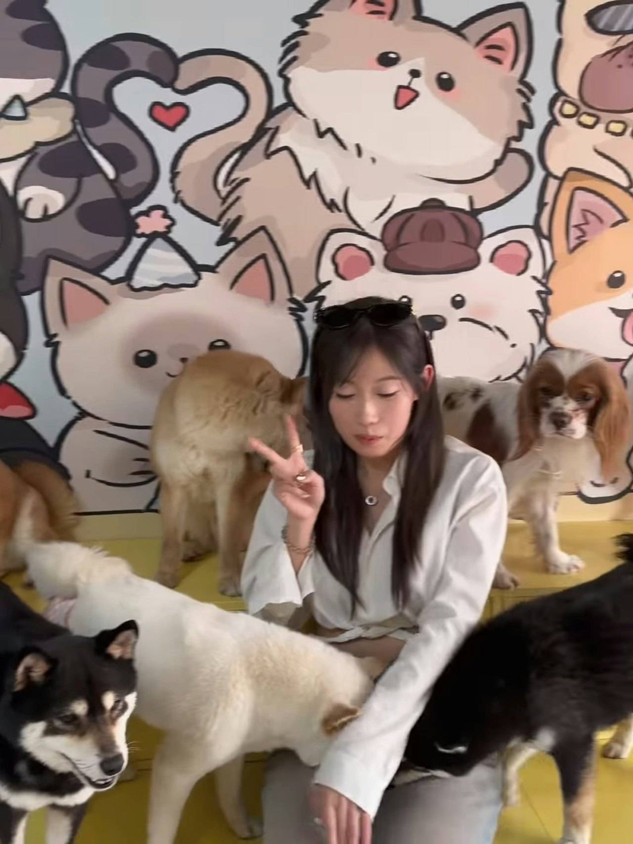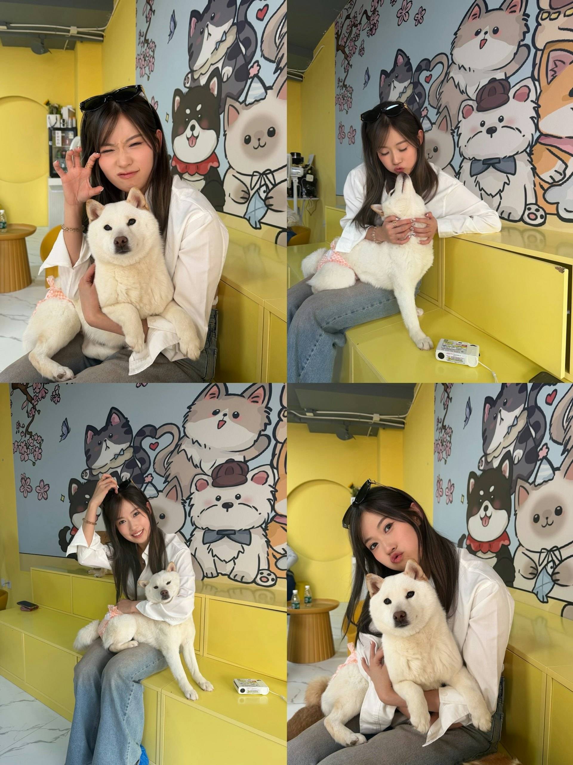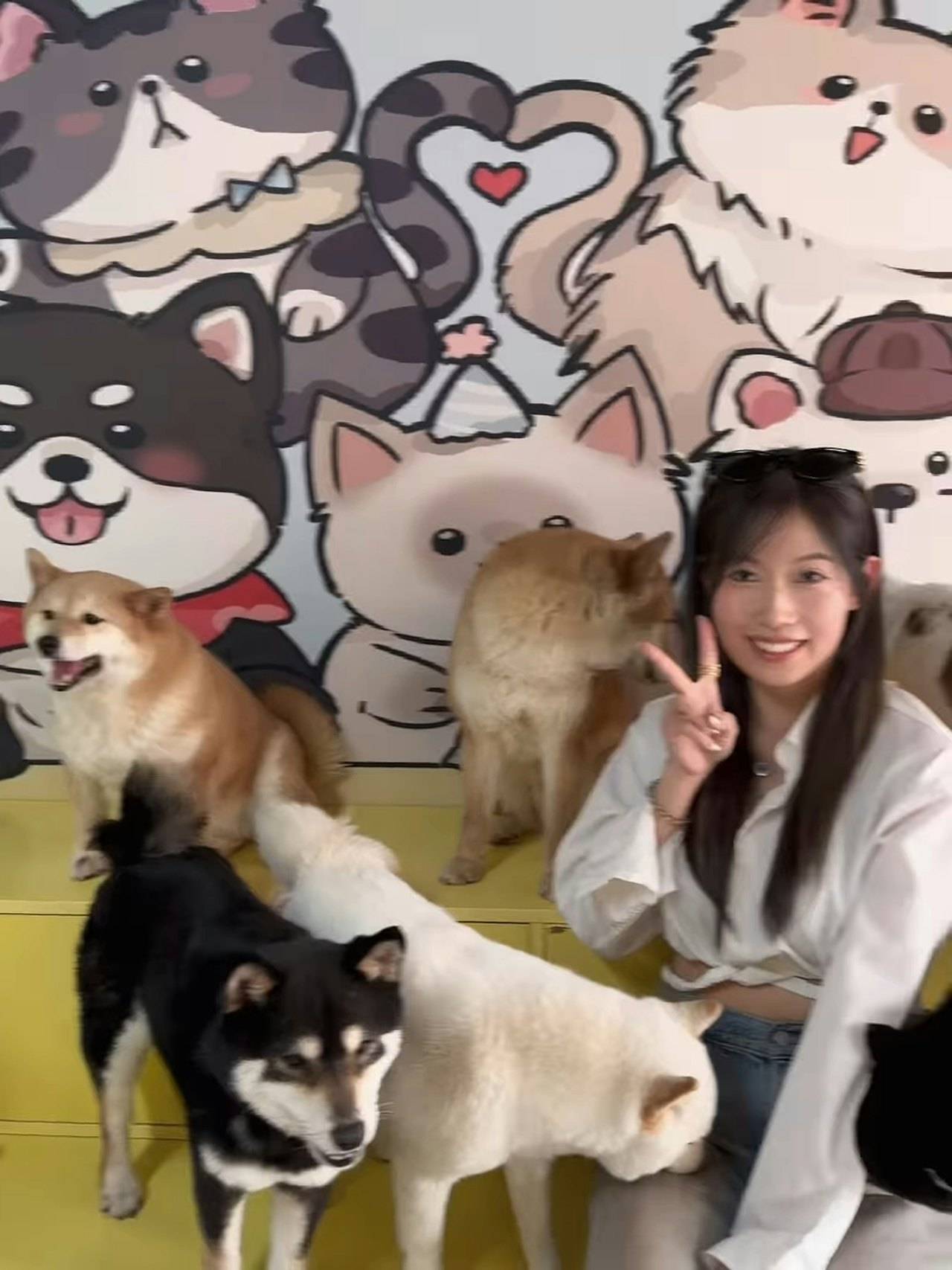 雖然波波這次「背住」愛犬粟米沒有一同前往,但她在狗café的受歡迎程度絲毫不減。從她分享的合照和短片可見,現場10隻狗狗都對這位TVB女星展現出極大的熱情。其中一隻白色狗狗更是主動送上熱情之吻,讓波波笑得合不攏嘴。不過最令人印象深刻的,莫過於兩隻柴犬對她大腿位置的「深度探索」,牠們不停在波波下半身敏感部位聞來聞去,讓她哭笑不得。