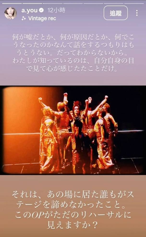 心有不甘的濱崎步近日(17日)更新限時動態,一口氣公開多條對空凳演出片段,態度堅定地表明不想參與真假的討論。她在貼文中寫道:「我只知道自己親眼所見的、內心感受到的」、「那天在現場的所有人,沒有任何一個人放棄舞台」,更直接反問質疑者:「這看起來只是排練嗎?」從影片可見,濱崎步在空無一人的演唱會場地內全力演出,舞台燈光效果齊全,完全不像一般綵排的簡陋設置。