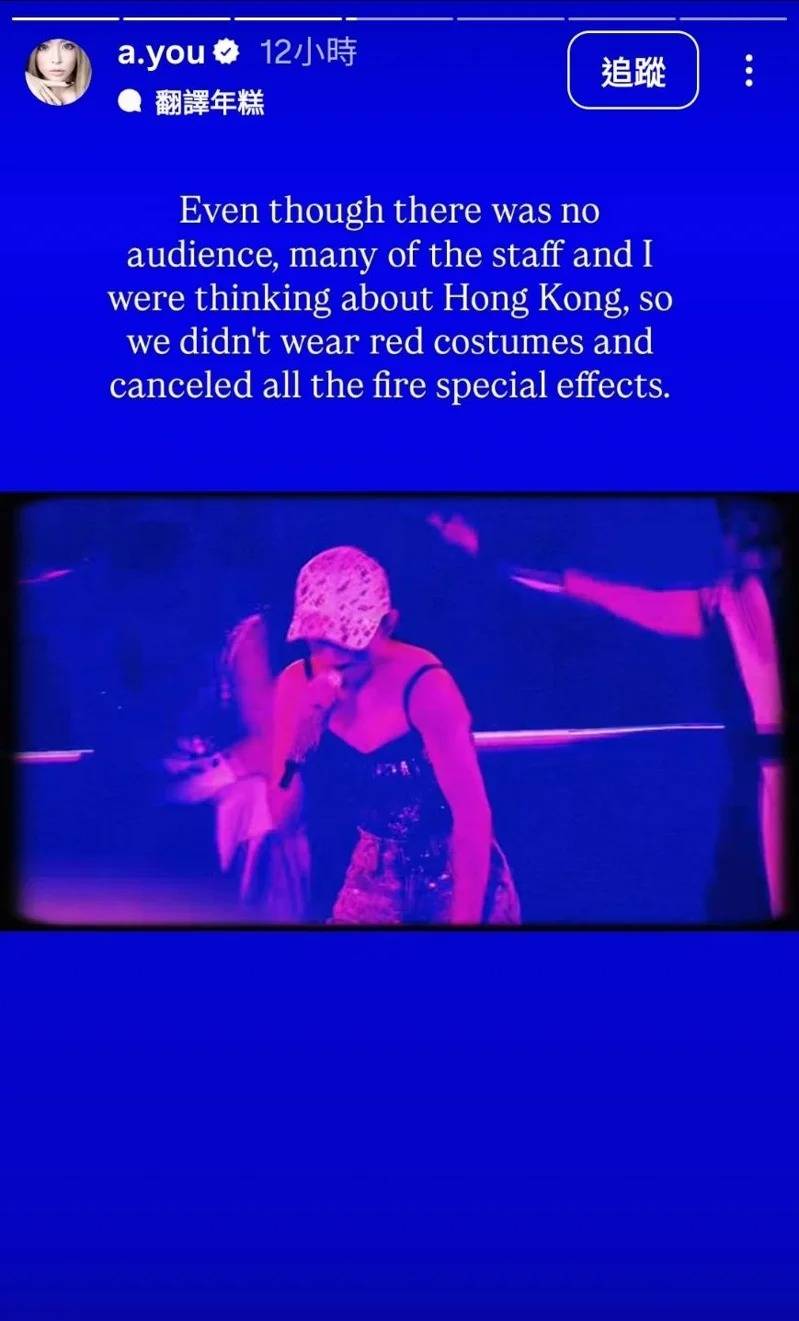 濱崎步亦透露了一個鮮為人知的細節,她以英文寫道,雖然當日演出沒安排觀眾入場,但為顧及當時大埔宏福苑大火不久,特意取消了紅色服裝及所有火花特效,以示對死難者的尊重。這個貼心安排顯示出濱崎步對香港社會事件的關注,即使在沒有觀眾的情況下,仍然考慮到社會氛圍而調整演出內容,展現出國際藝人的社會責任感。