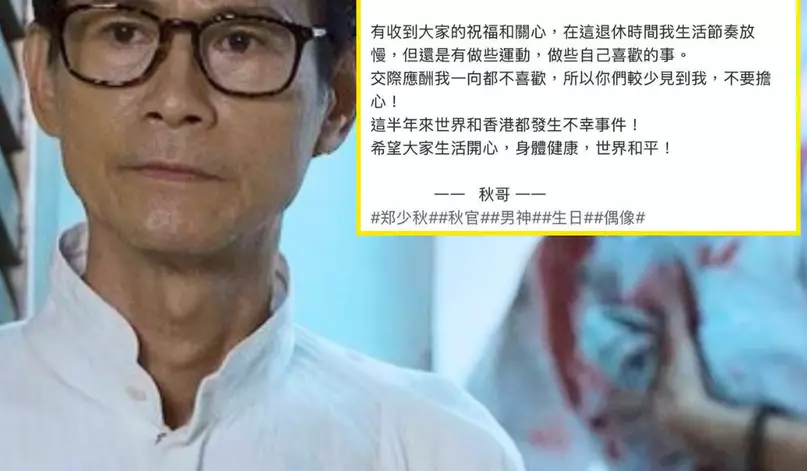 昨日適逢鄭少秋農曆生日,一個名為「秋官藝術館鮮動網絡」的微博帳號分享署名「秋哥」的感言,這是秋官神隱近3年來首次主動發聲。感言中寫道「有收到大家的祝福和關心,在這退休時間我生活節奏放慢,但還是有做些運動,做些自己喜歡的事。交際應酬我一向都不喜歡,所以你們較少見到我,不要擔心!」秋官更提及「這半年來世界和香港都發生不幸事件!希望大家生活開心,身體健康,世界和平!」該帳號由影迷會成立,每年定期發布秋官給影迷的訊息。