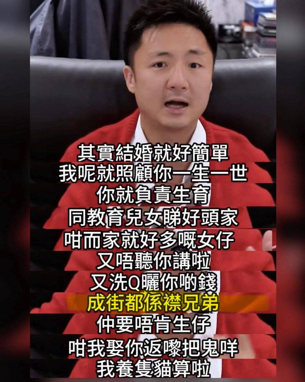 去年10月同期,鍾培生發放多段婚姻偉論影片,在片中剖析自己對婚姻的價值觀。他大膽形容結婚就如動漫《鋼之鍊金術師》中的「等價交換」法則,指出婚後男方會負責照顧女方一生一世,為對方提供優渥的物質生活條件與財力支持。這些涉及等價交換及生育責任的言論,當時在網絡上引爆極大爭議。現在回看,這些影片很可能是鍾培生為求婚做準備,向外界表達自己對婚姻的認真態度和承諾。