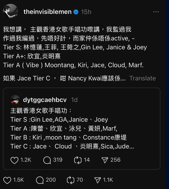 有趣的是,當有網民將近年急速上位的Jace陳凱詠評為C級唱功時,馮翰銘立即在帖文中拉埋Gen Z至愛落水:「如果Jace Tier C,咁Nancy Kwai應該係…」,這句意味深長的回應瞬間引爆網民討論。馮翰銘將陳凱詠列入A級(Vibe)類別,與Moon Tang(鄧凱文)、Kiri T、Cloud(雲浩影)、Marf(邱彥筒)等歌手同級,顯然認為網民的C級評價過於苛刻。這個對比更凸顯了專業音樂人與一般聽眾在評價標準上的差異,也讓人重新思考如何客觀評價歌手的唱功水平。