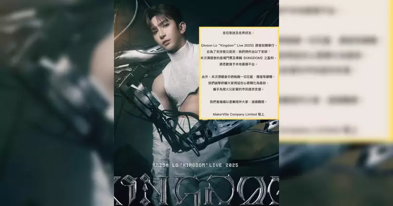 今日下午,Anson Lo的經理人公司MakerVille在官方社交平台發出正式聲明,宣布演唱會將如期舉行的同時,作出特別安排支援災民。聲明指出「本次演唱會的首場門票及專輯《KINGDOM》之盈利,將悉數捐予本地募捐平台」,展現出藝人的社會責任感。除了捐出收益外,演唱會更將「婉謝一切花籃、應援等饋贈」,呼籲粉絲將心意轉化為善款,攜手為受火災影響的市民提供支援。
