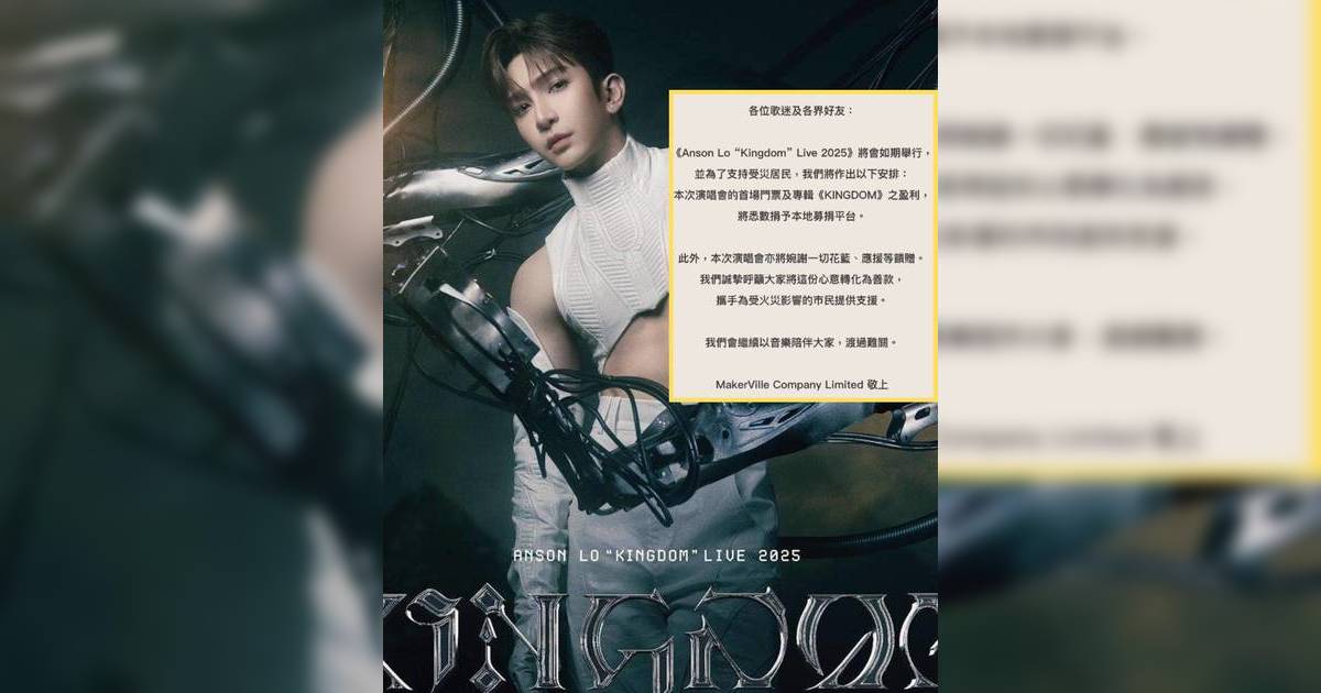 MakerVille在聲明中表示「各位歌迷及各界好友:《Anson Lo “Kingdom” Live 2025》將會如期舉行,並為了支持受災居民,我們將作出以下安排」,正式確認演唱會將按原定計劃進行。公司強調「我們誠摯呼籲大家將這份心意轉化為善款,攜手為受火災影響的市民提供支援」,希望將原本用於應援的資源轉為實際幫助。聲明最後以「我們會繼續以音樂陪伴大家,渡過難關」作結,展現出藝人與粉絲共度時艱的決心。