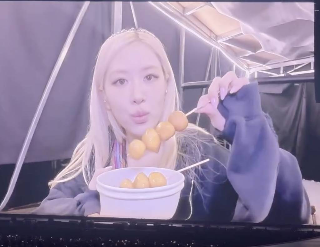 首場演出中,Rosé率先以街頭小食雞蛋仔打頭陣,她驚喜拎著熱騰騰的雞蛋仔即場試味,一口咬下後露出滿足笑容。可愛的吃相瞬間令全場粉絲瘋狂高呼「Cute到爆」,不少觀眾更激動地拍手叫好。Rosé邊吃邊點頭表示讚賞,還不忘向台下粉絲展示手中的雞蛋仔,現場氣氛瞬間被推向高潮。