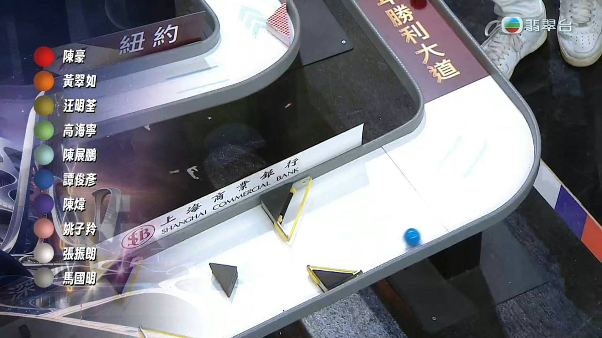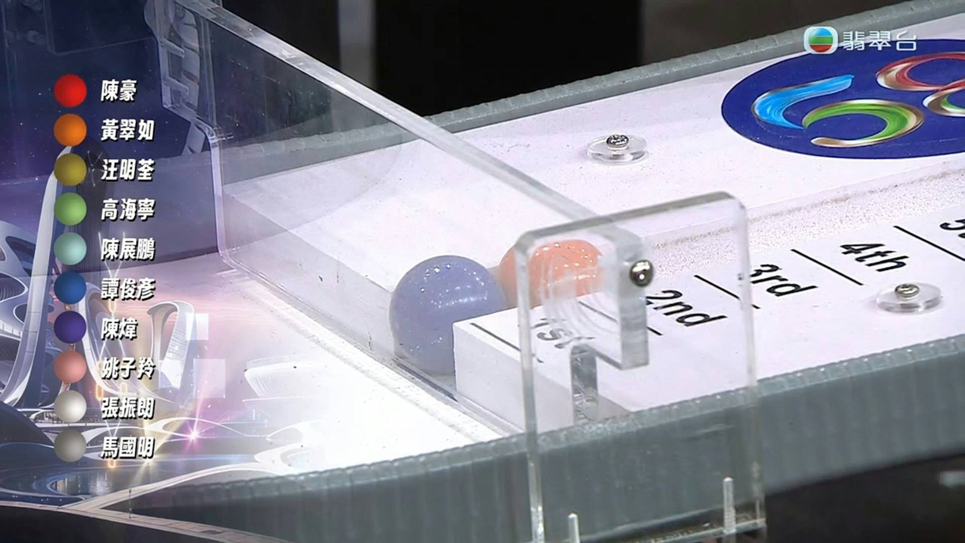台慶壓軸環節「翡翠明珠」彈珠賽決定50萬免找數簽賬額得主時,出現令全場錯愕的一幕。陳豪、黃翠如、汪明荃、高海寧、陳展鵬、譚俊彥、陳煒、姚子羚、張振朗、馬國明等10位藝人代表各持不同顏色彈珠參賽,陳展鵬的淺藍色彈珠一馬當先,表現由頭帶到尾。正當曾志偉、鍾志光、朱凱婷、區永權等司儀都宣布「淺藍色」得勝,朱凱婷準備說出「陳展鵬」名字時,眾人突然一臉錯愕,收到指示要「嚟多個圈」。鍾志光急忙打圓場說「賽事要增加刺激性呀」,但第二輪比賽結果由陳煒的紫色彈珠勝出,她與隊友平分50萬獎金。