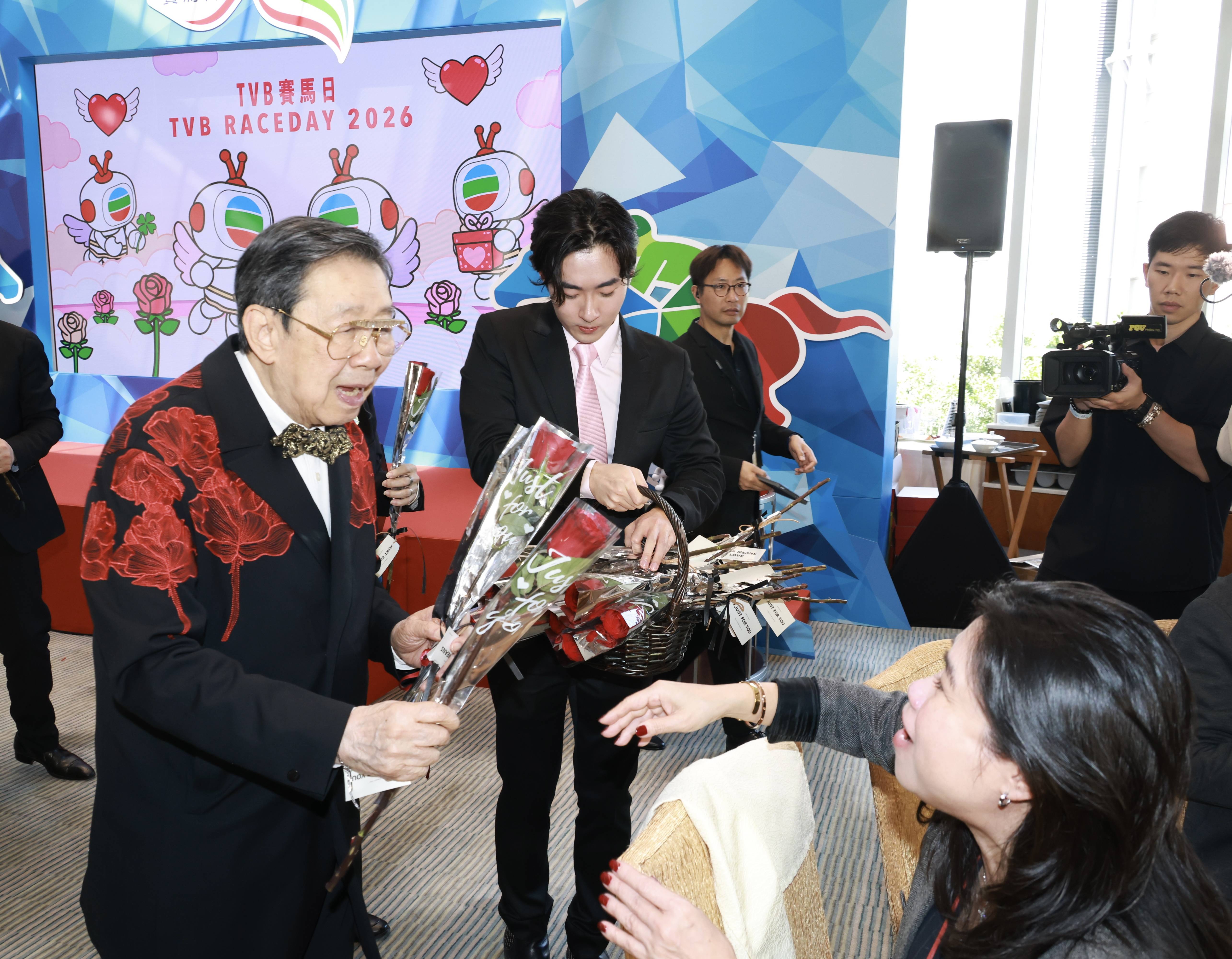 今日「TVB 賽馬日」活動撞正情人節,大會特意安排連串應節環節,當中最大驚喜莫過於由胡楓(修哥)壓軸登場!現年已94歲的修哥活力十足,竟驚喜化身愛神「修」比特,手持玫瑰花束現身,向在場一眾嘉賓及藝人送上「愛的玫瑰」,大派情人節祝福。修哥可愛又精靈的造型一出場即引來全場起哄,不少藝人爭相與「修」比特合照,場面溫馨又搞笑,成功為緊張的賽馬日注入滿滿的甜蜜氣氛。