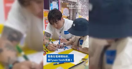 願望成真基金團隊精心安排,讓Tyson Yoshi在充滿童趣的室內遊樂場與喬喬見面。平日形象冷酷的Tyson一出場,喬喬即刻心心眼,兩人在色彩繽紛的波波池中嬉戲玩樂。Tyson更化身最溫柔的大哥哥,耐心陪喬喬串珠仔手鏈、一起拿起畫筆塗顏色,笑聲與色彩填滿整個空間。見面期間,Tyson還親自拍片鼓勵喬喬:「喬喬,加油努力!希望好快見面啦!」為她注入更多勇氣面對治療。