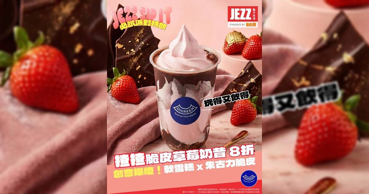人氣品牌「#DIGREEN」今次真係創意爆燈!強勢推出全新「#揸揸脆皮草莓奶昔」,完美示範咩叫「有得玩又有得飲」!成杯奶昔 100% 採用品牌自家製嘅香濃軟雪糕打成,杯身內層仲邪惡地裹上一層厚厚嘅脆皮朱古力🤤!