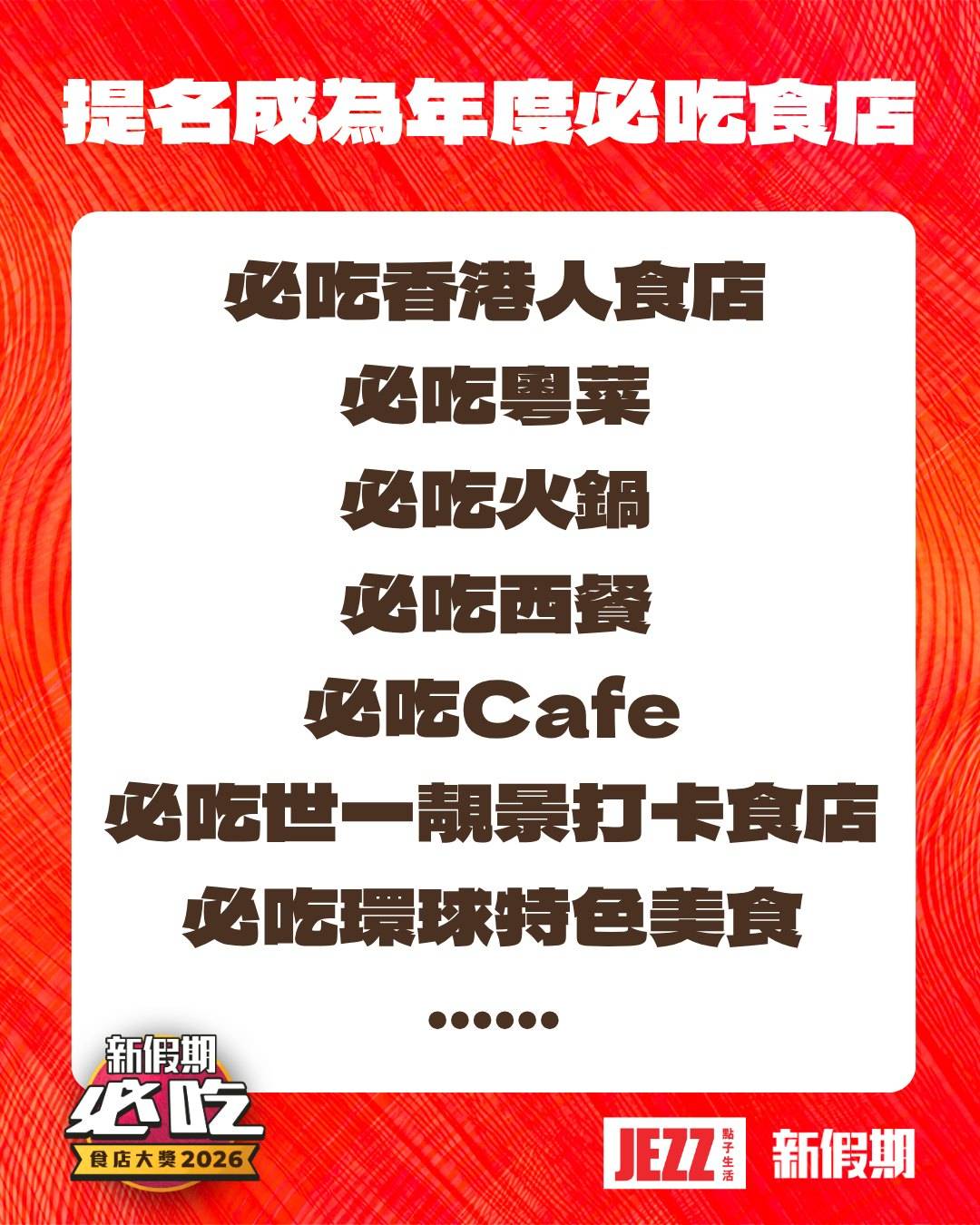 ✅ 誠邀餐廳品牌自薦提名! 只要你對自己嘅出品有信心,想喺 2026 年同我哋一齊引領本地飲食熱潮,打造專屬你嘅「必吃」標籤,就快啲加入我哋!