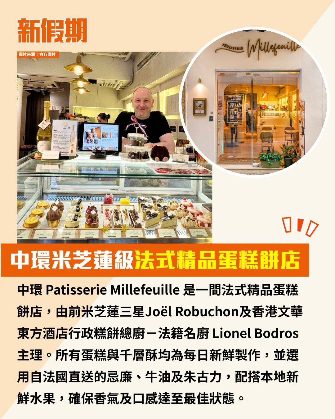 中環 Patisserie Millefeuille 是一間法式精品蛋糕餅店,由前米芝蓮三星Joël Robuchon及香港文華東方酒店行政糕餅總廚-法籍名廚 Lionel Bodros 主理。所有蛋糕與千層酥均為每日新鮮製作,並選用自法國直送的忌廉、牛油及朱古力,配搭本地新鮮水果,確保香氣及口感達至最佳狀態。