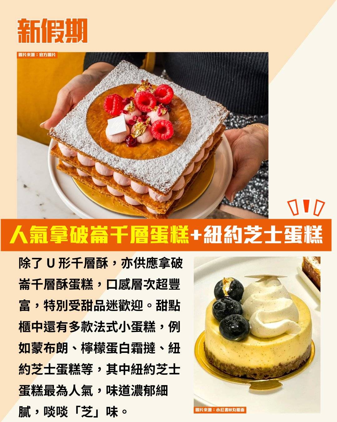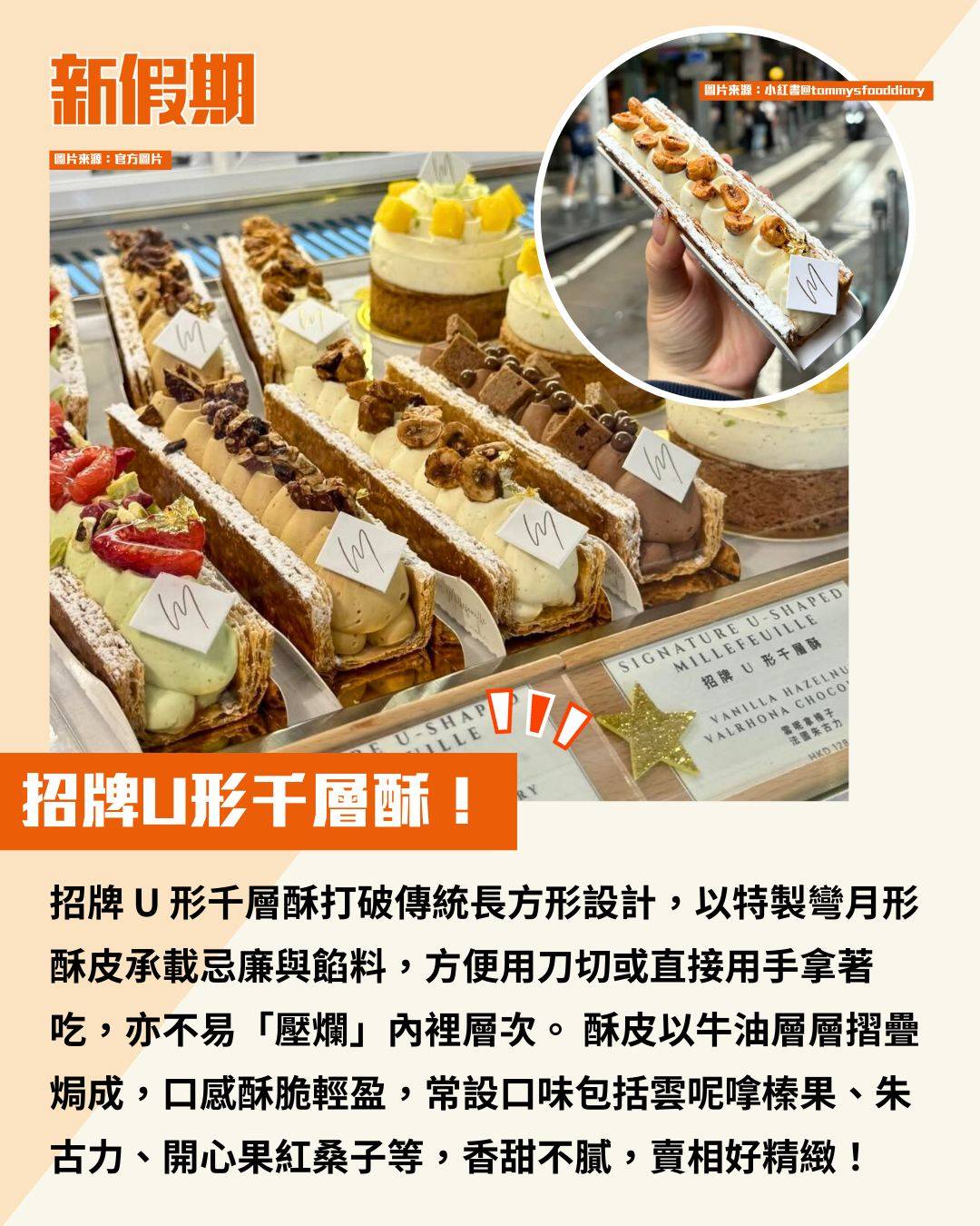 招牌 U 形千層酥打破傳統長方形設計,以特製彎月形酥皮承載忌廉與餡料,方便用刀切或直接用手拿著吃,亦不易「壓爛」內裡層次。 酥皮以牛油層層摺疊焗成,口感酥脆輕盈,常設口味包括雲呢嗱榛果、朱古力、開心果紅桑子等,香甜不膩,賣相好精緻!