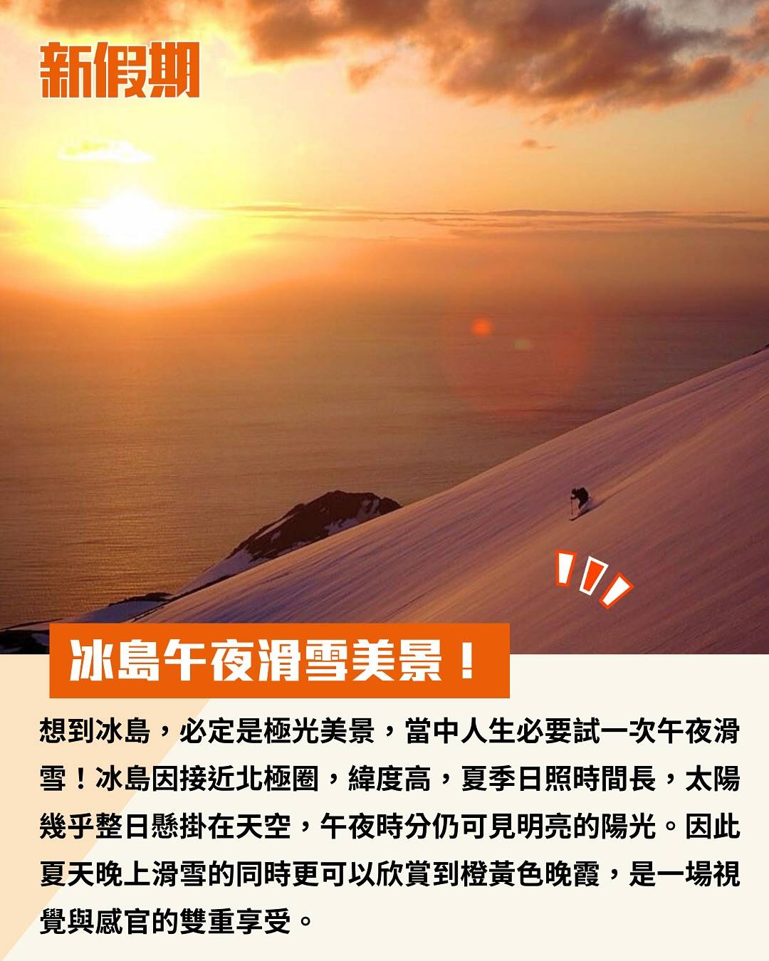 想到冰島,必定是極光美景,當中人生必要試一次午夜滑雪!冰島因接近北極圈,緯度高,夏季日照時間長,太陽幾乎整日懸掛在天空,午夜時分仍可見明亮的陽光。因此夏天晚上滑雪的同時更可以欣賞到橙黃色晚霞,是一場視覺與感官的雙重享受。