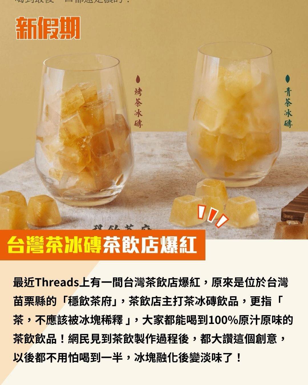 最近Threads上有一間台灣茶飲店爆紅,原來是位於台灣苗栗縣的「穩飲茶府」,茶飲店主打茶冰磚飲品,更指「 茶,不應該被冰塊稀釋 」,大家都能喝到100%原汁原味的茶飲飲品!網民見到茶飲製作過程後,都大讚這個創意,以後都不用怕喝到一半,冰塊融化後變淡味了!