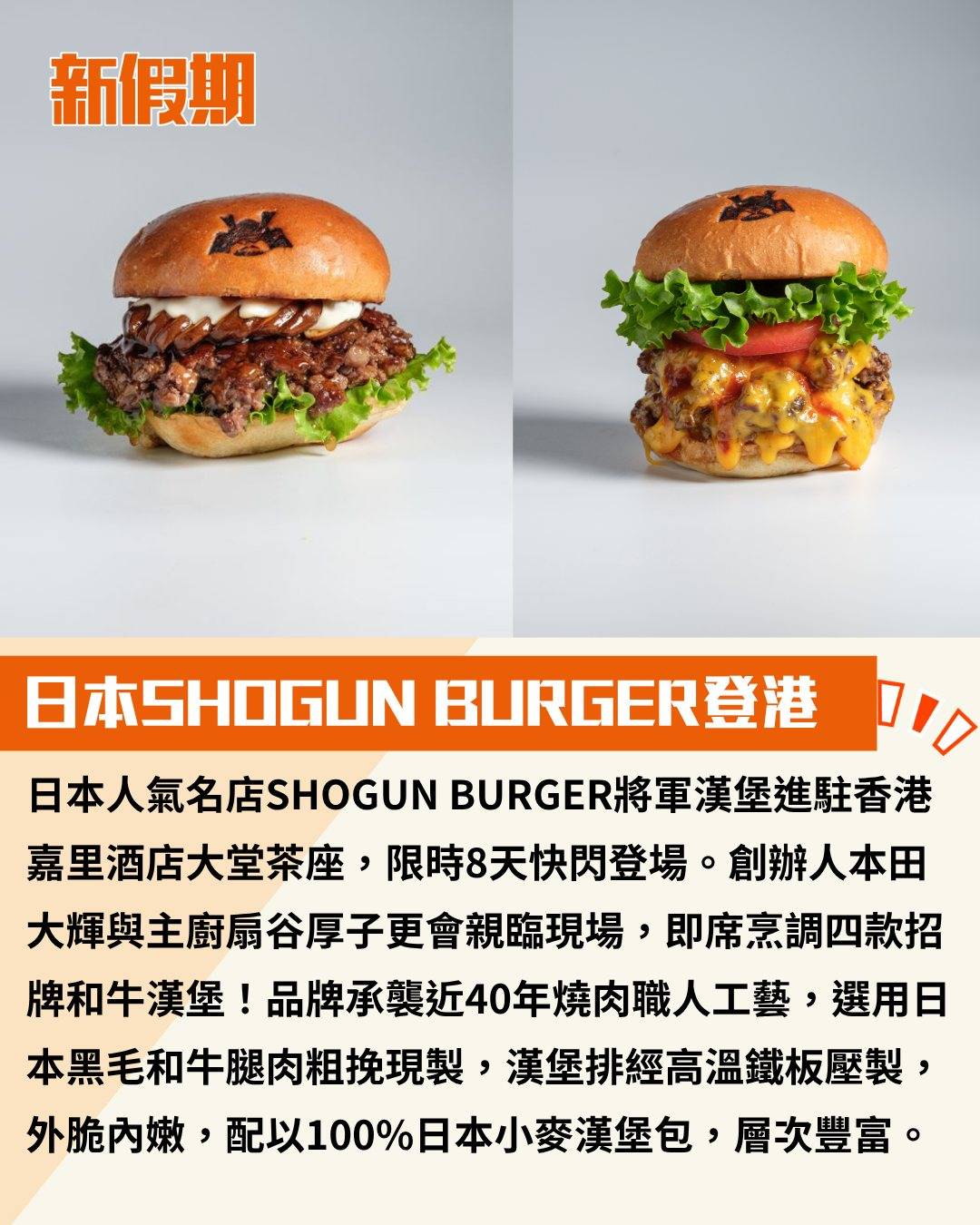 日本人氣名店SHOGUN BURGER將軍漢堡進駐香港嘉里酒店大堂茶座,限時8天快閃登場。創辦人本田大輝與主廚扇谷厚子更會親臨現場,即席烹調四款招牌和牛漢堡!品牌承襲近40年燒肉職人工藝,選用日本黑毛和牛腿肉粗挽現製,漢堡排經高溫鐵板壓製,外脆內嫩,配以100%日本小麥漢堡包,層次豐富。