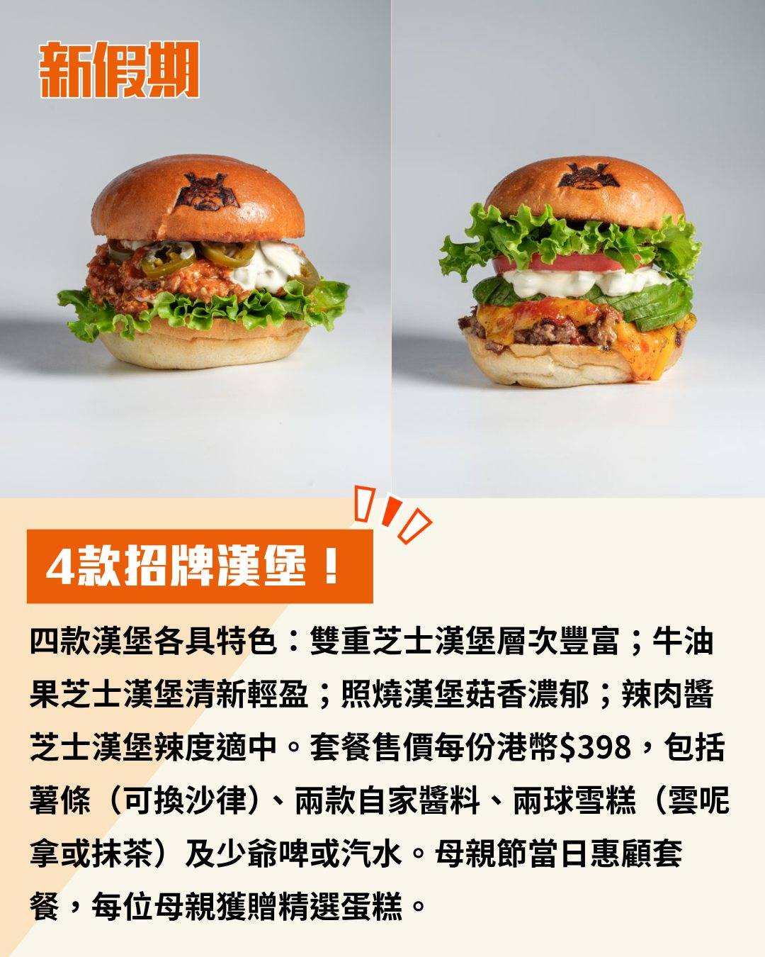 四款漢堡各具特色:雙重芝士漢堡層次豐富;牛油果芝士漢堡清新輕盈;照燒漢堡菇香濃郁;辣肉醬芝士漢堡辣度適中。套餐售價每份港幣$398,包括薯條(可換沙律)、兩款自家醬料、兩球雪糕(雲呢拿或抹茶)及少爺啤或汽水。母親節當日惠顧套餐,每位母親獲贈精選蛋糕。
