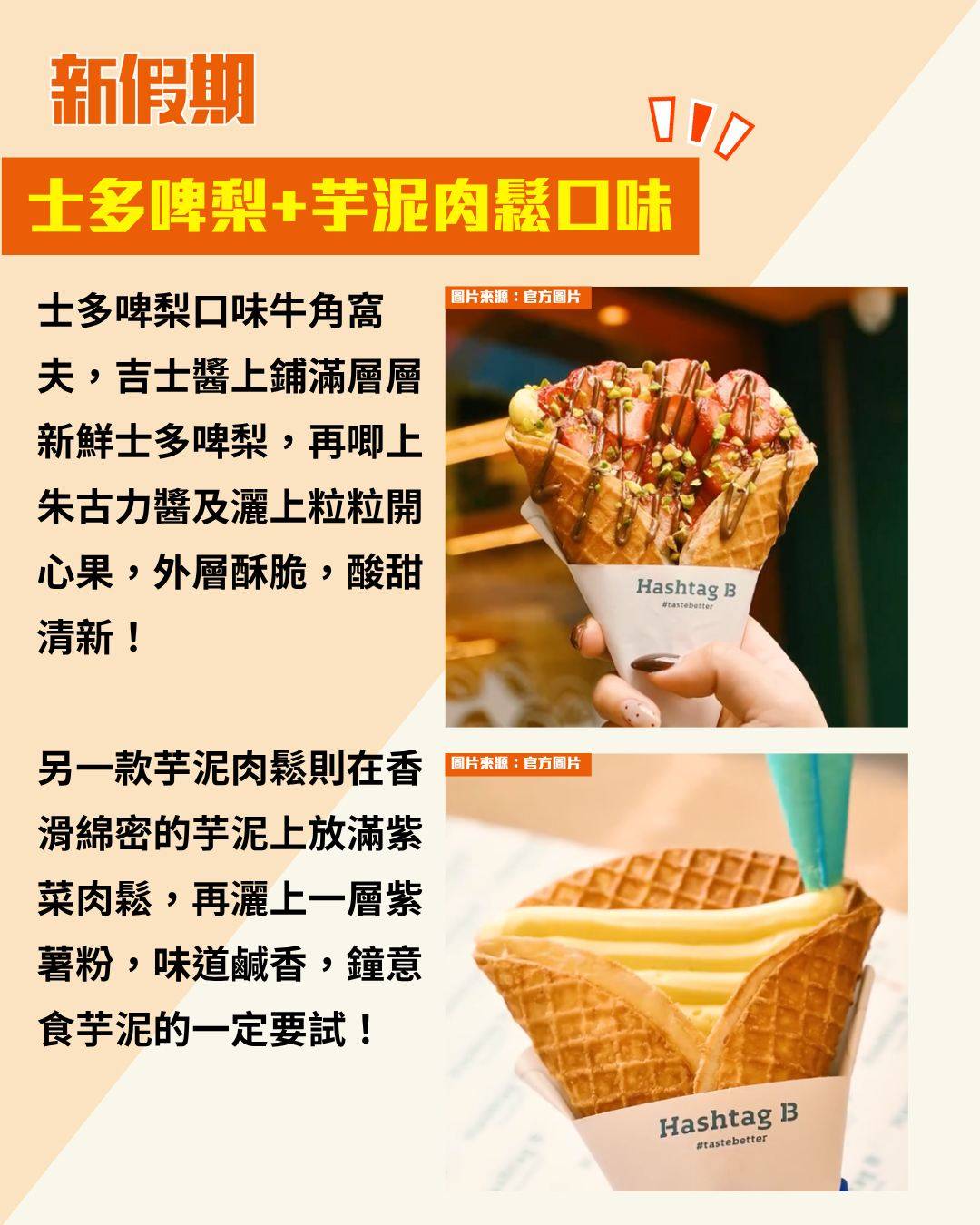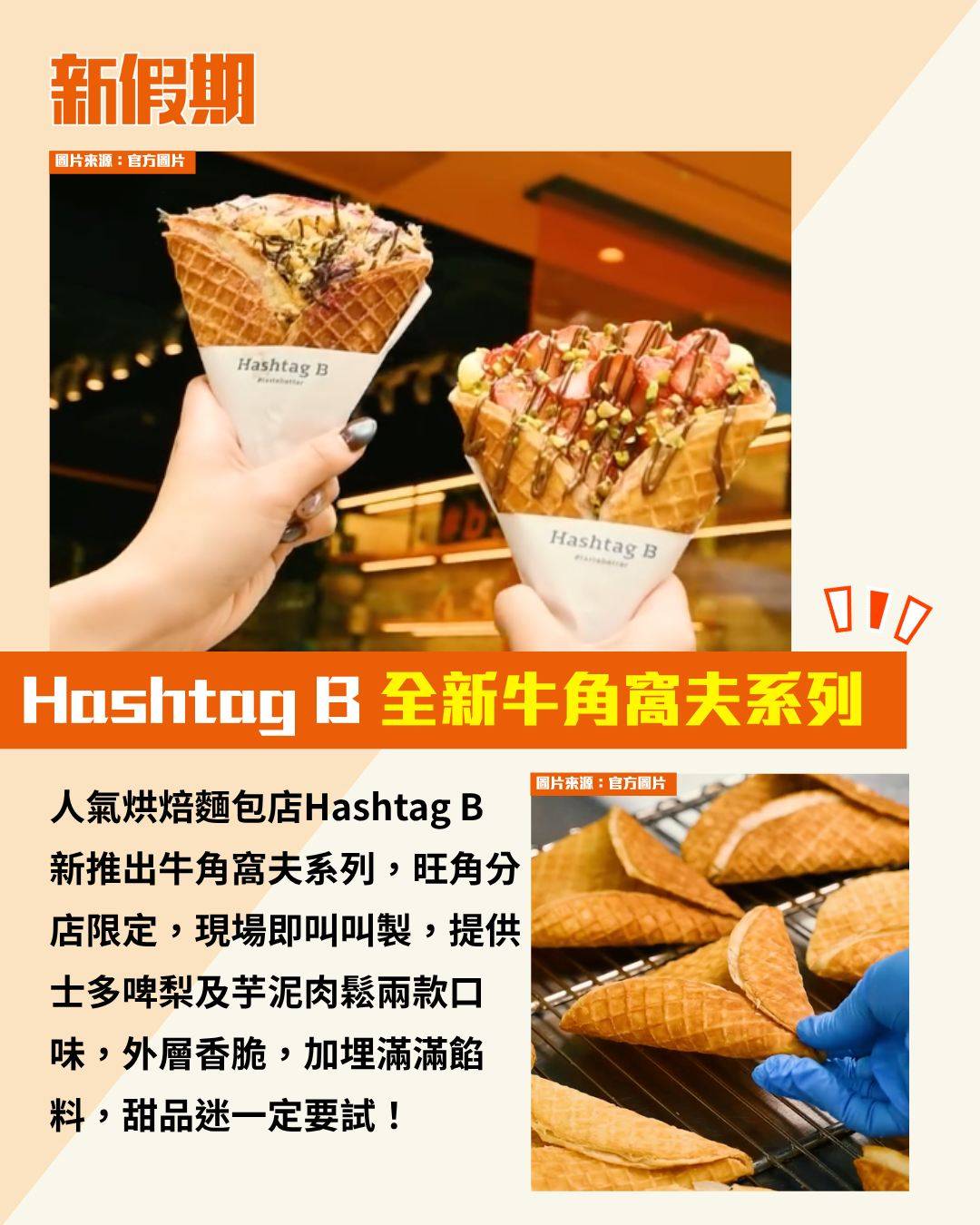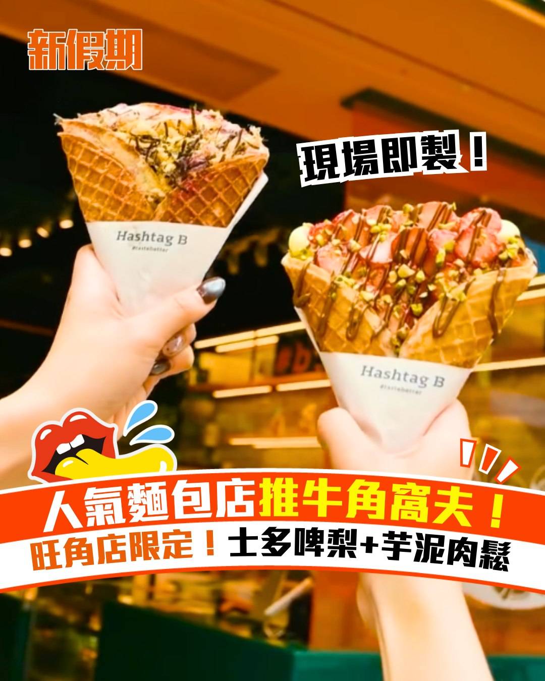 人氣烘焙麵包店Hashtag B 新推出牛角窩夫系列,旺角分店限定,現場即叫叫製,提供士多啤梨及芋泥肉鬆兩款口味,外層香脆,加埋滿滿餡料,甜品迷一定要試!