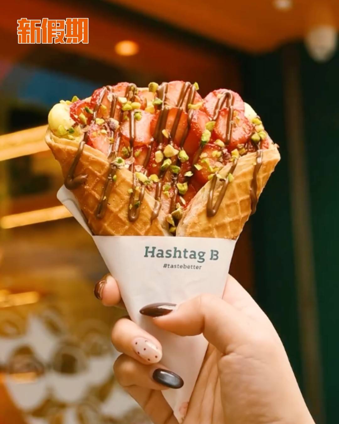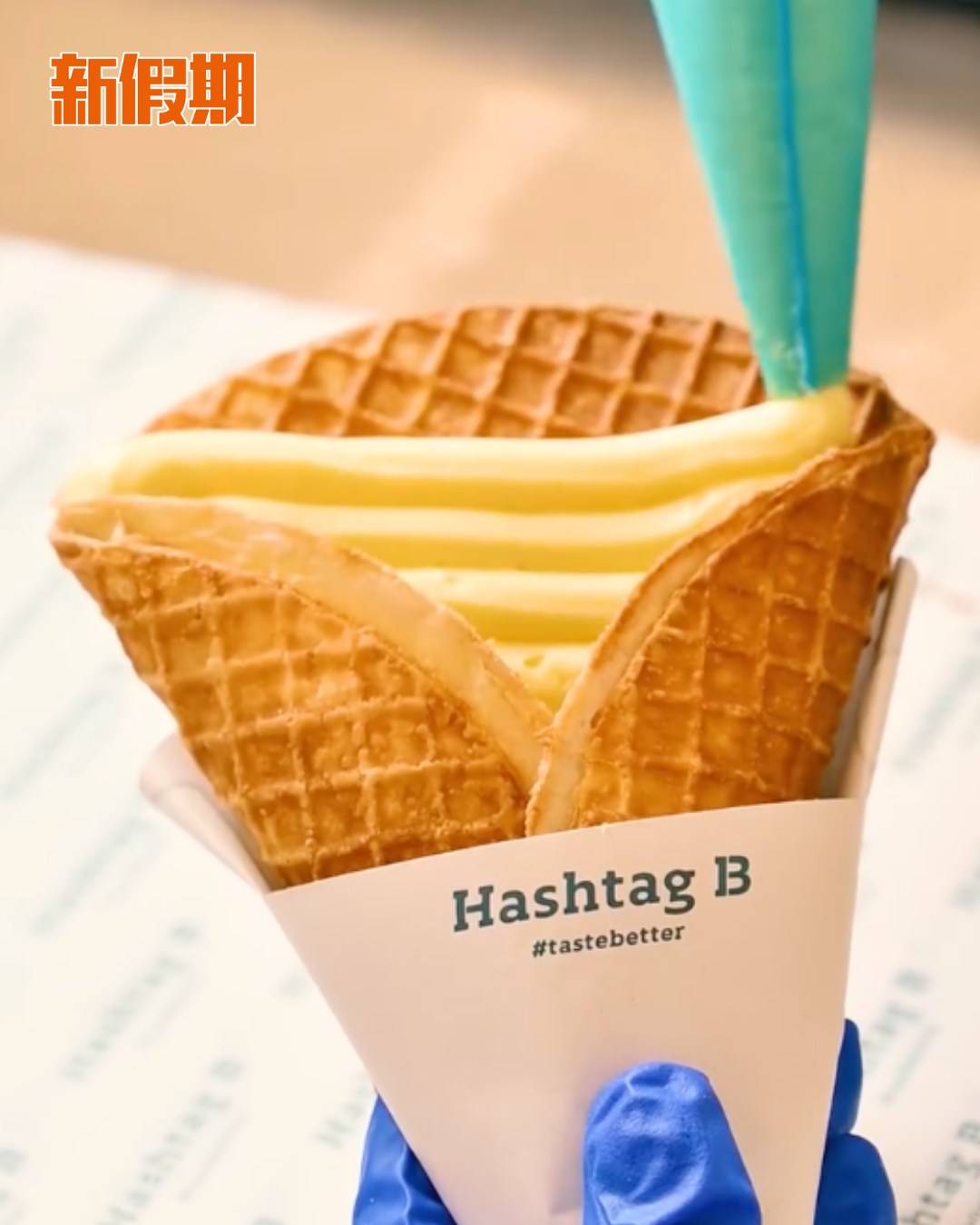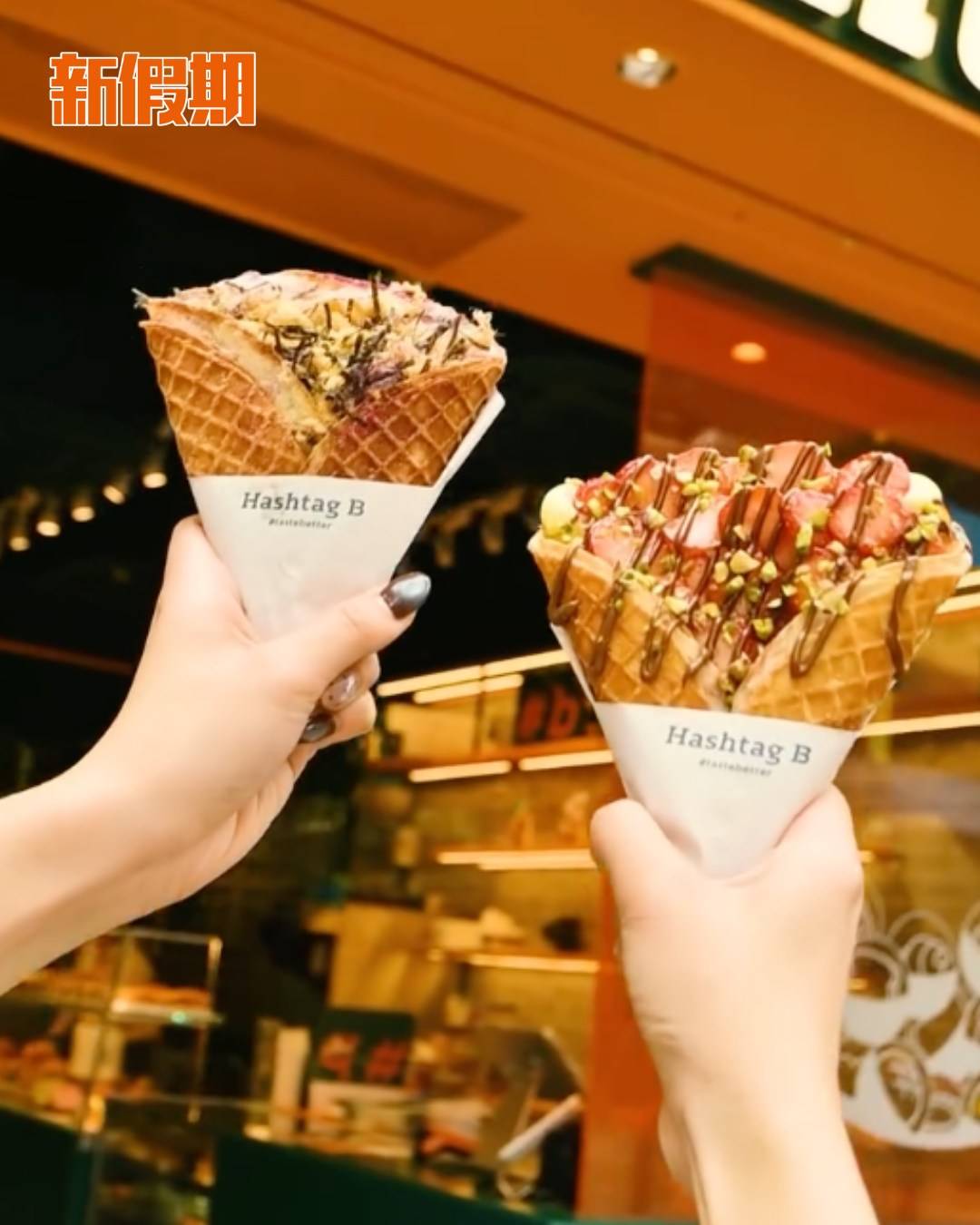 人氣烘焙麵包店Hashtag B 新推出牛角窩夫系列,旺角分店限定,現場即叫叫製,提供士多啤梨及芋泥肉鬆兩款口味,外層香脆,加埋滿滿餡料,甜品迷一定要試!