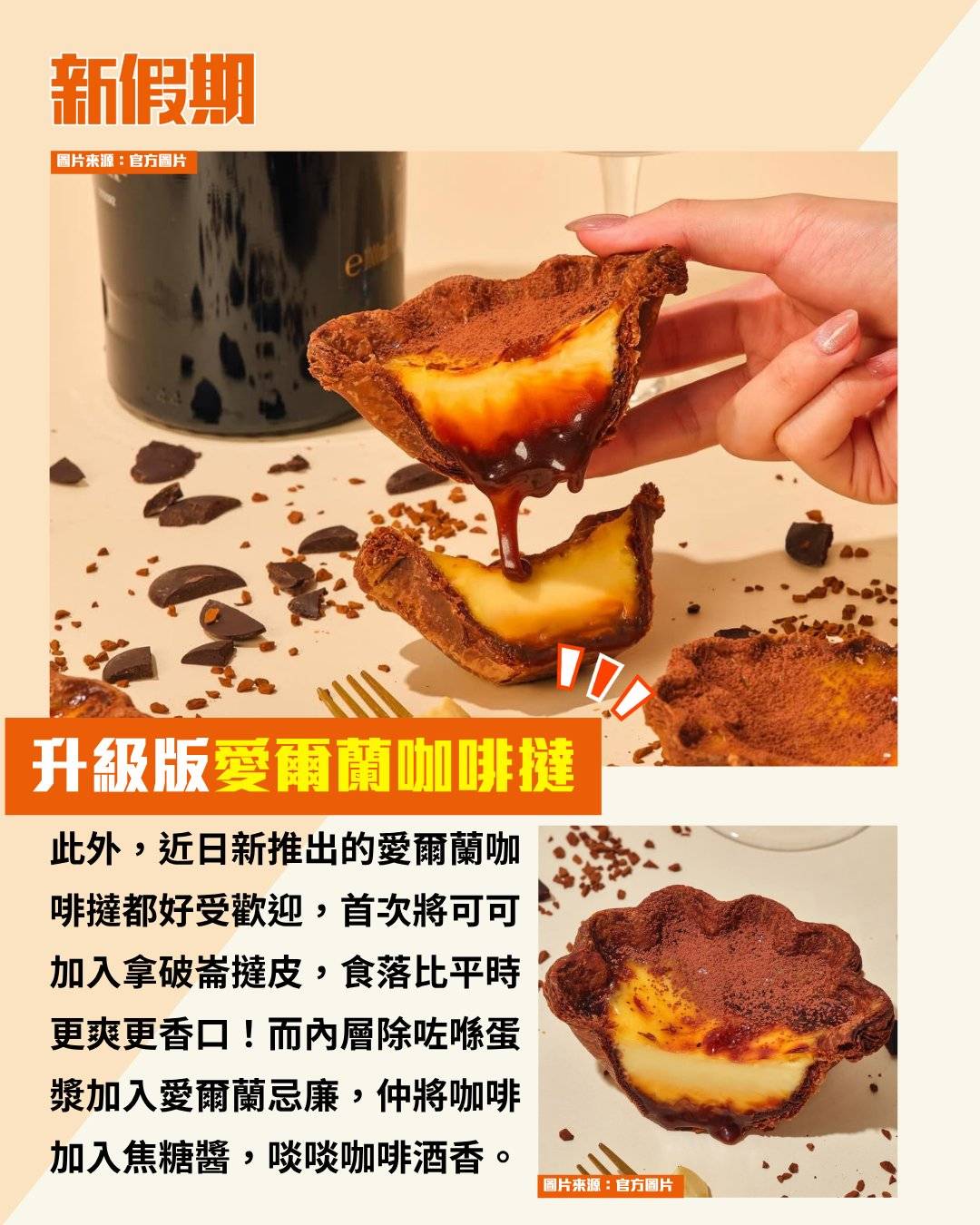 此外,近日新推出的愛爾蘭咖啡撻都好受歡迎,首次將可可加入拿破崙撻皮,食落比平時更爽更香口!而內層除咗喺蛋漿加入愛爾蘭忌廉,仲將咖啡加入焦糖醬,啖啖咖啡酒香。