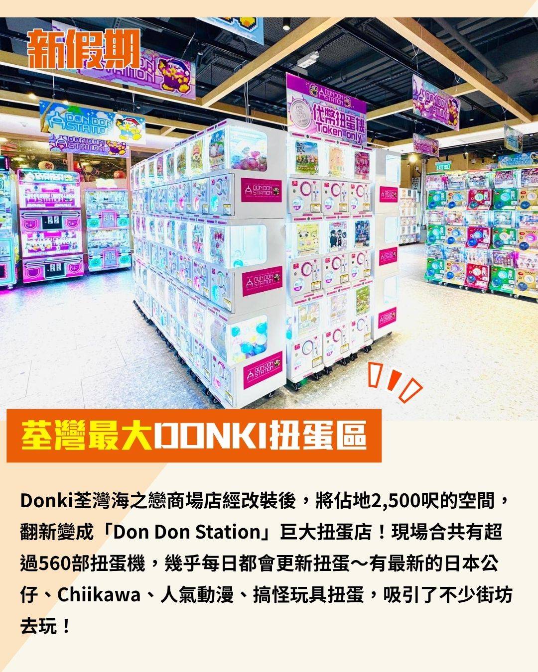 Donki荃灣海之戀商場店將佔地2,500呎的空間,翻新變成「Don Don Station」巨大扭蛋店!現場合共有超過560部扭蛋機,幾乎每日都會更新扭蛋~有最新的日本公仔、Chiikawa、人氣動漫、搞怪玩具扭蛋,吸引了不少街坊去玩!