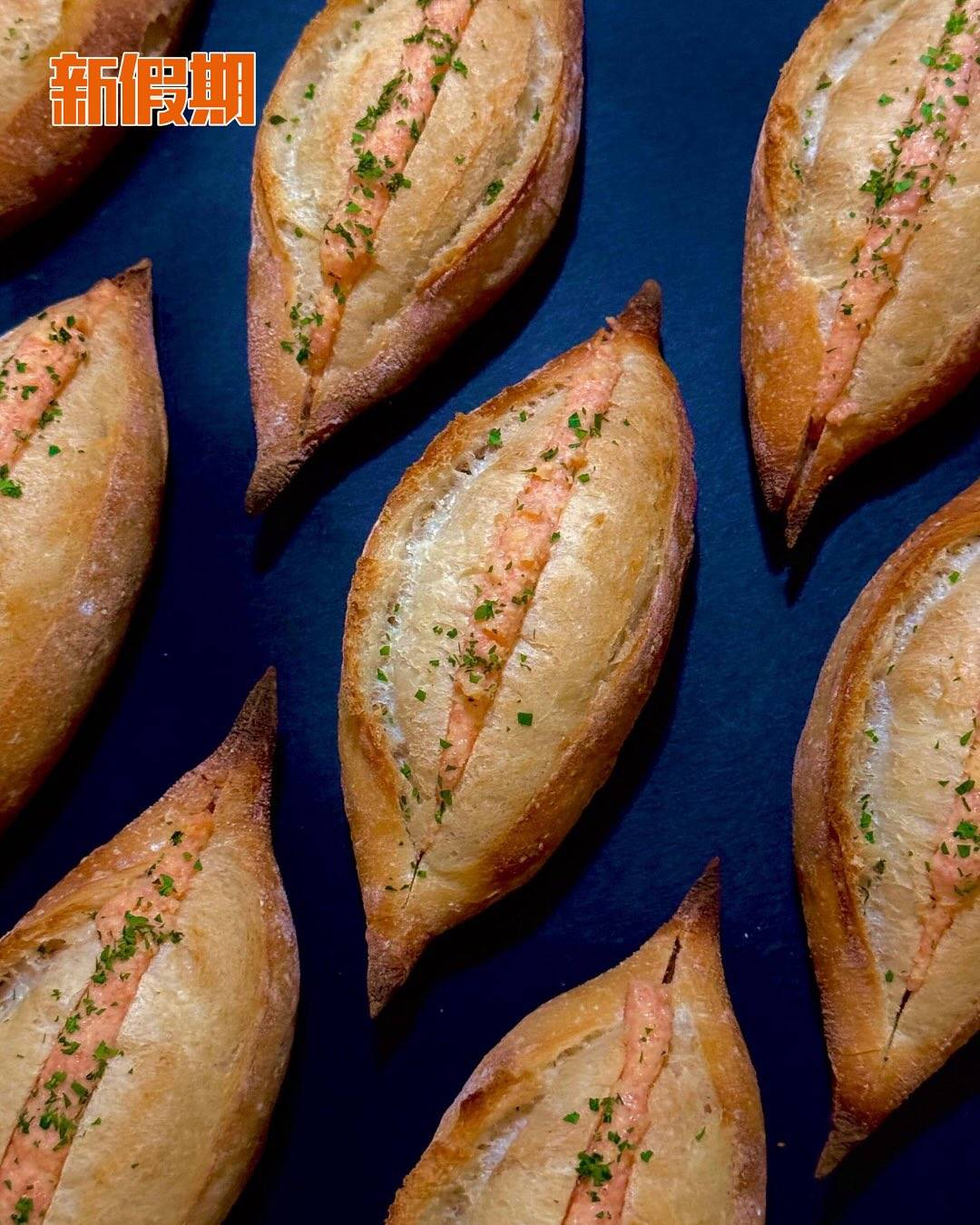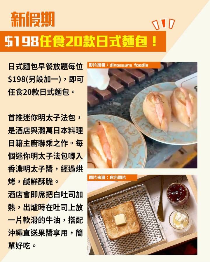 日式麵包早餐放題每位$198(另設加一),即可任食20款日式麵包。首推迷你明太子法包,是酒店與灘萬日本料理日籍主廚聯乘之作。每個迷你明太子法包唧入香濃明太子醬,經過烘烤,鹹鮮酥脆。酒店會即席把白吐司加熱,出爐時在吐司上放一片軟滑的牛油,搭配沖繩直送果醬享用,簡單好吃。
